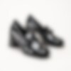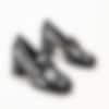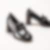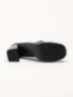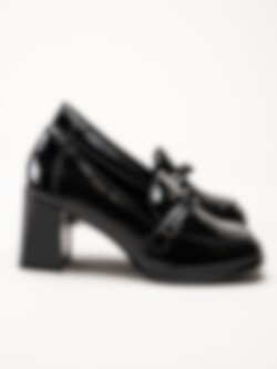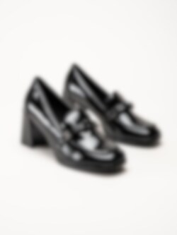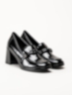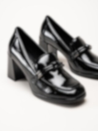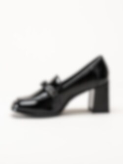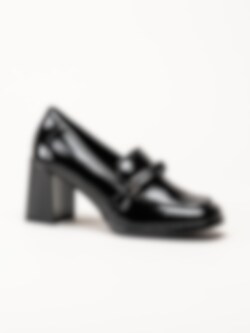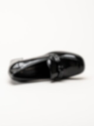 Svarta högklackade loafers i lack från Marco Tozzi. Läckra loafersliknande pumps med fyrkantig tå och länk framtil. Bekväm blockklack på 8 cm. Snygg modell som passar lika bra till vardags som till fest! 100% veganska.