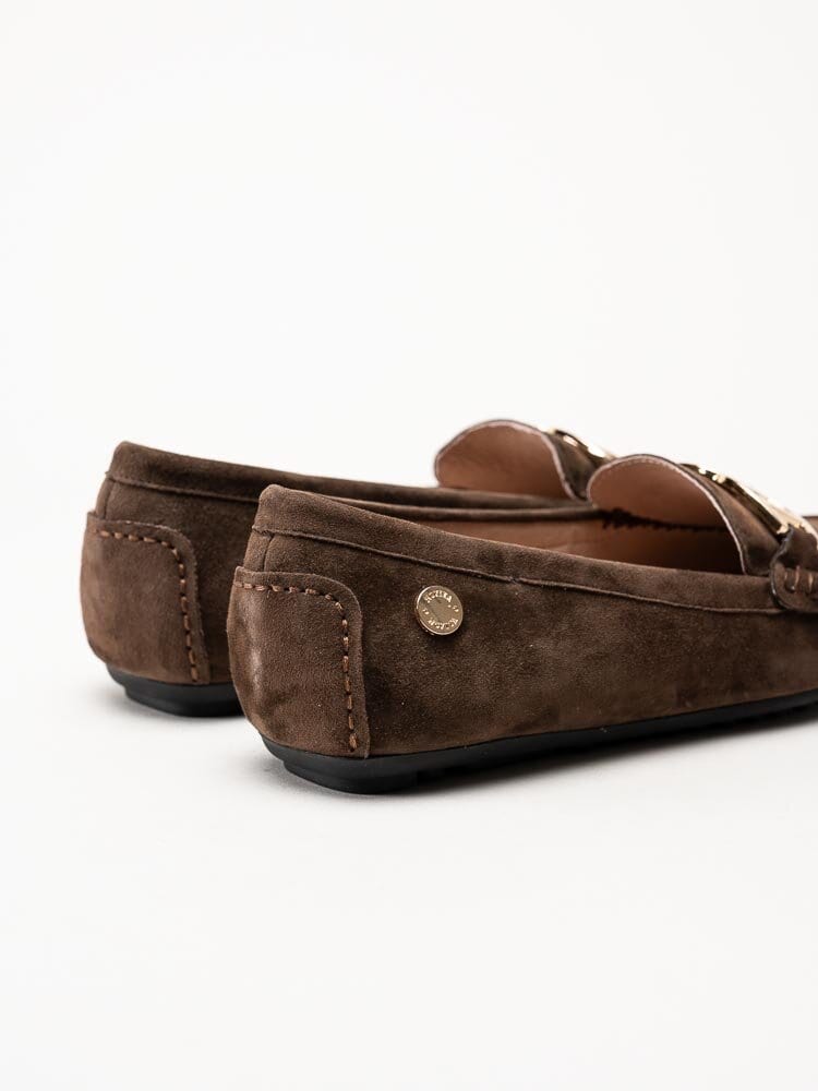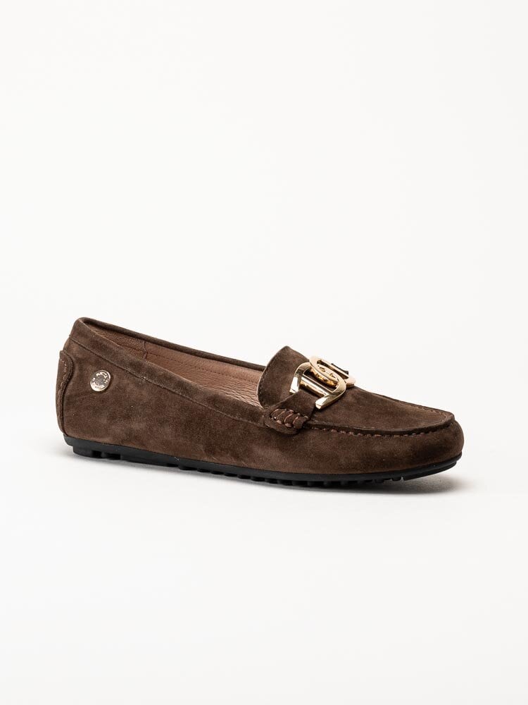 Mörkbruna loafers i mocka Parma Royal från Novita. Skorna är tillverkade i mjuk mocka som ger ett stilrent och följsamt uttryck. Den klassiska loafer-modellen kompletteras av ett guldfärgat spänne framtill som tillför en elegant detalj.