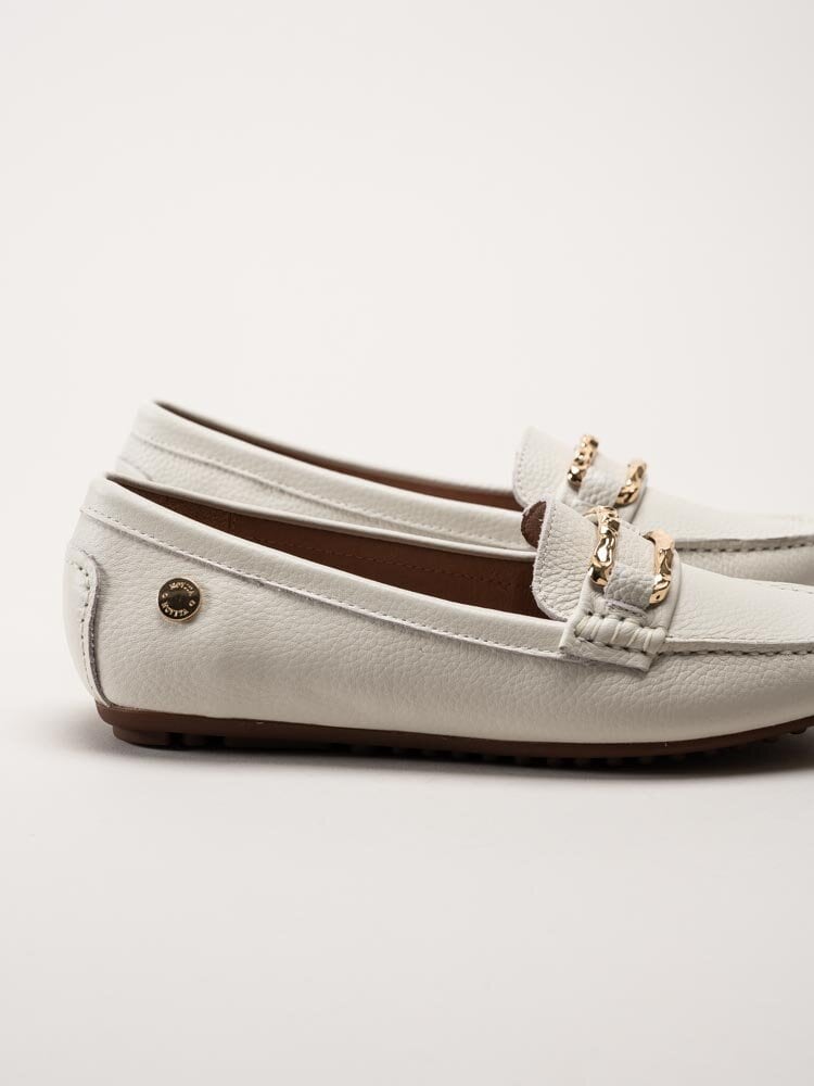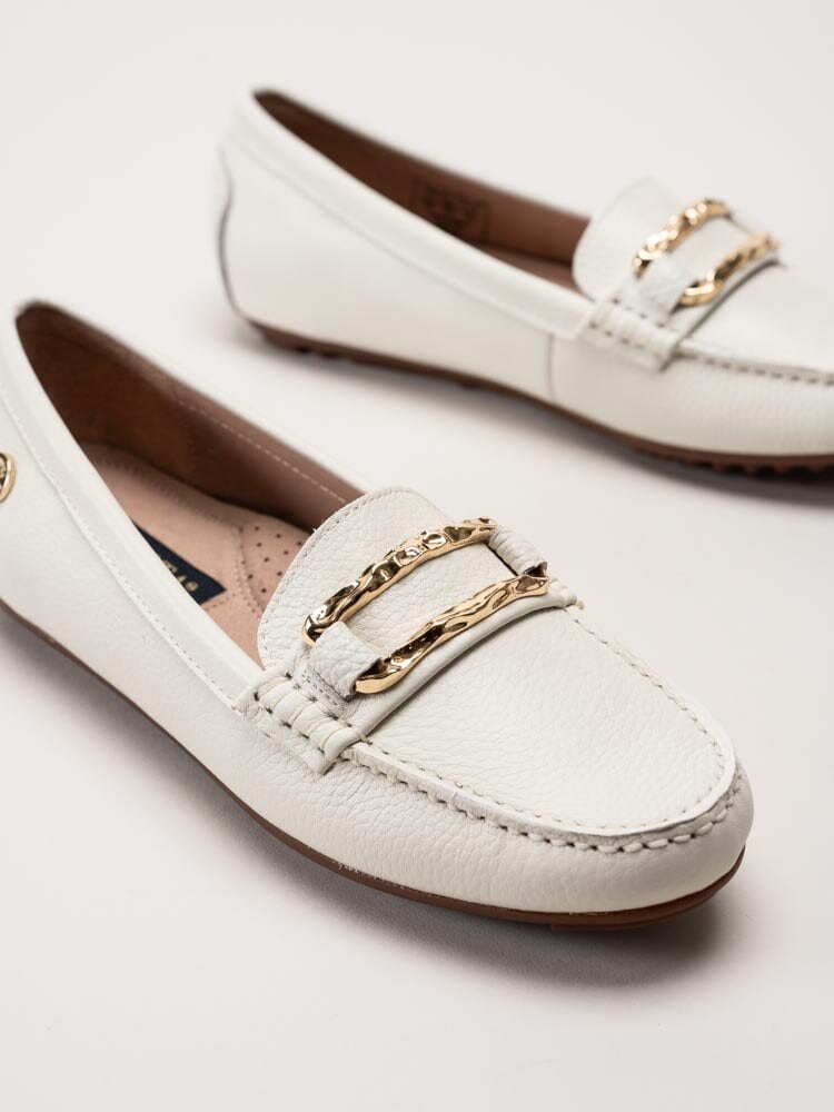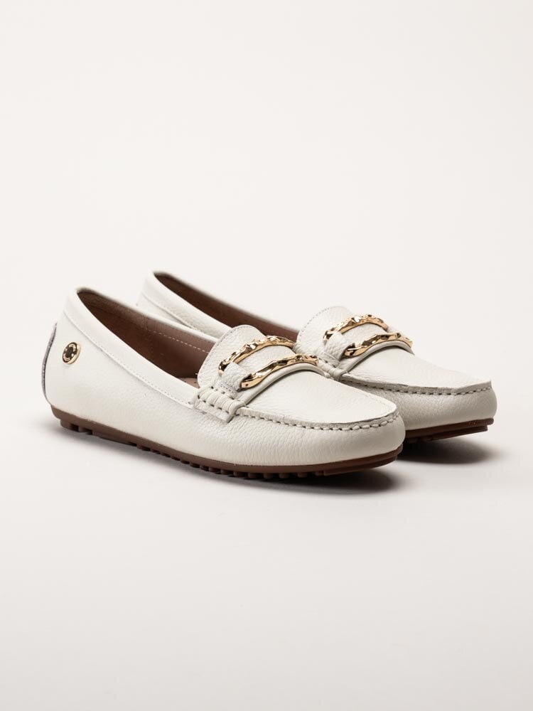 Vita loafers i skinn Parma från Novita. Skorna är tillverkade i mjukt skinn som ger ett stilrent och följsamt uttryck. Den klassiska loafer-modellen kompletteras av ett guldfärgat spänne framtill som tillför en elegant och lyxig detalj.