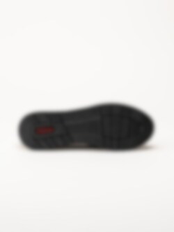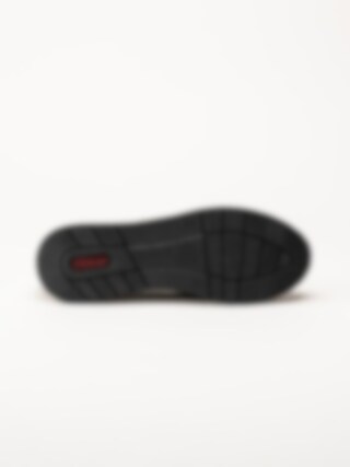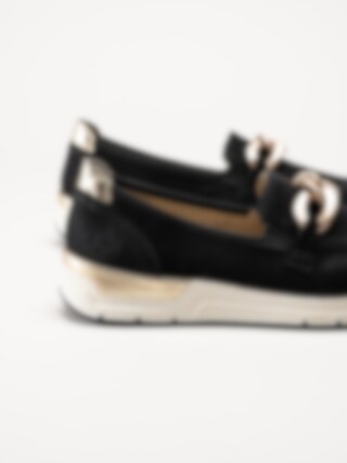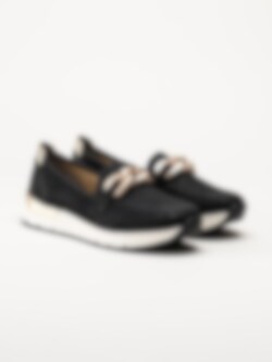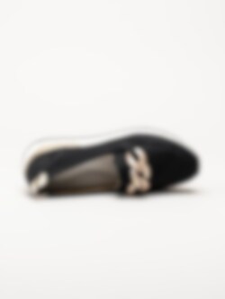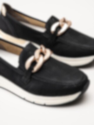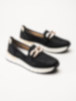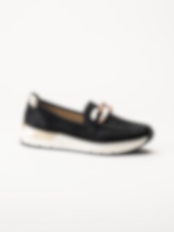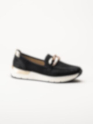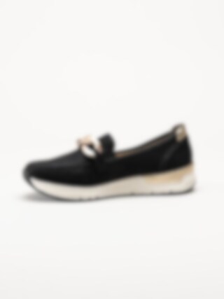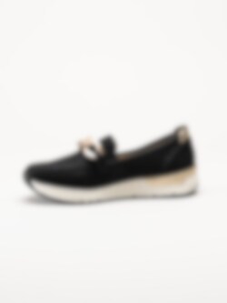 Svarta sportiga loafers med guldfärgad länk från Rieker. Bekväma loafers med sportig yttersula och dekorativ länk på bladet. Liten resår på sidorna och gulddetalj på bakkappan. Foder och vadderad löstagbar innersula i textil med Rieker Antistress teknologi, slitsula i gummi för ett bättre grepp mot underlaget. Riktigt fina loafers som känns bra på fötterna!