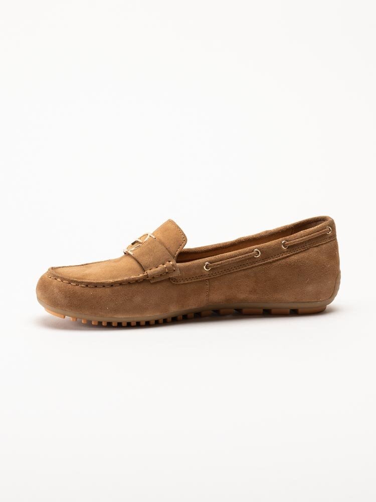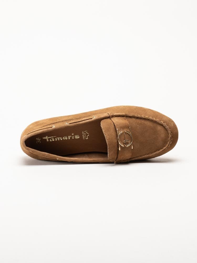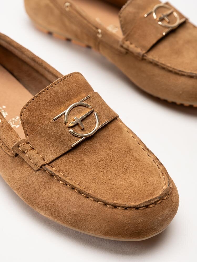 Bruna loafers i mocka från Tamaris i färgen Cognac. Skorna är tillverkade i mjuk mocka som ger ett stilrent och klassiskt intryck, med ett guldfärgat spänne som tillför en elegant detalj. Invändigt är modellen fodrade med textil, och den löstagbara innersulan i skinn ger komfort och stötdämpning under hela dagen. Yttersulan i gummiblandning med räfflad design säkerställer stabilitet och bra grepp.