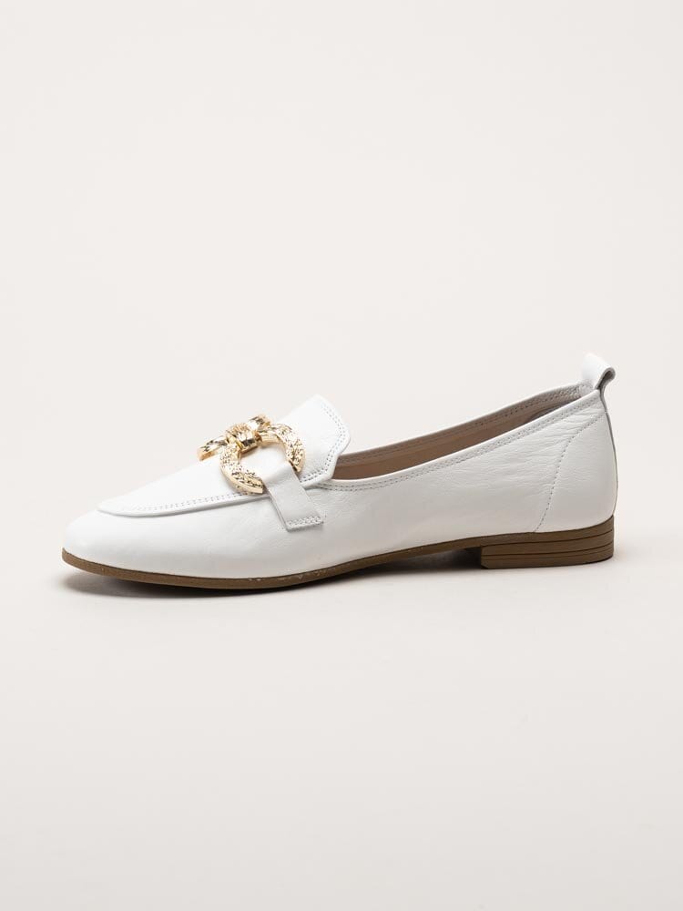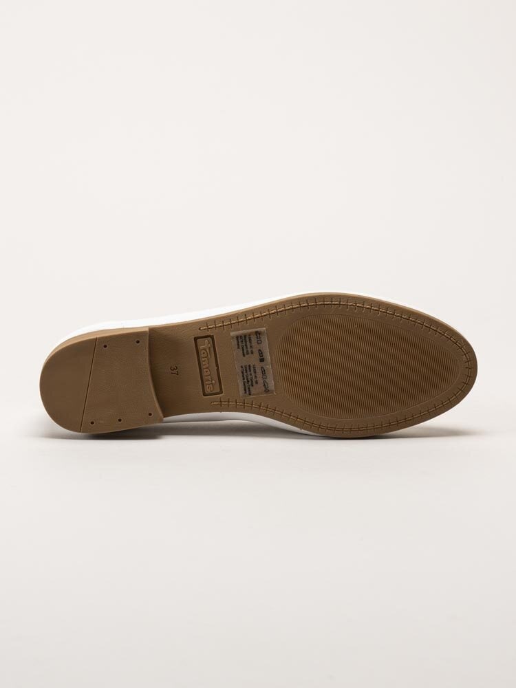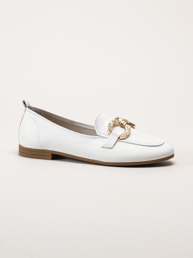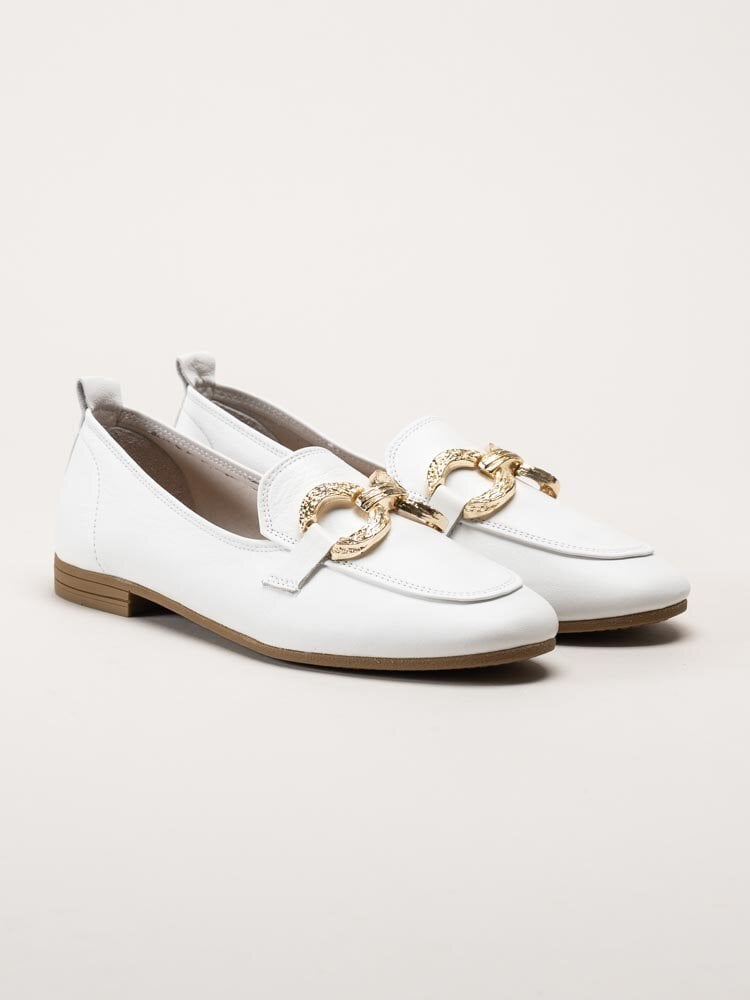 Vita loafers i skinn från Tamaris. Eleganta, nätta loafers med en stor dekorativ guldfärgad länk på ovansidan. Foder i textil, innersula i skinn med Tamaris Touch It teknologi. En snygg och bekväm modell att spendera våren i.