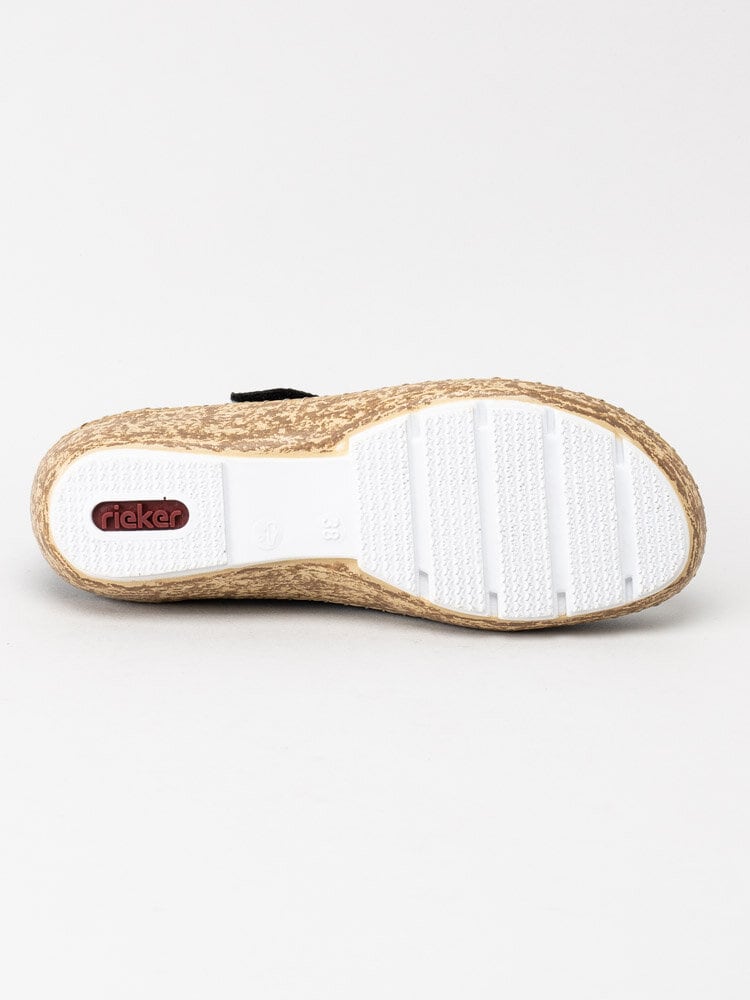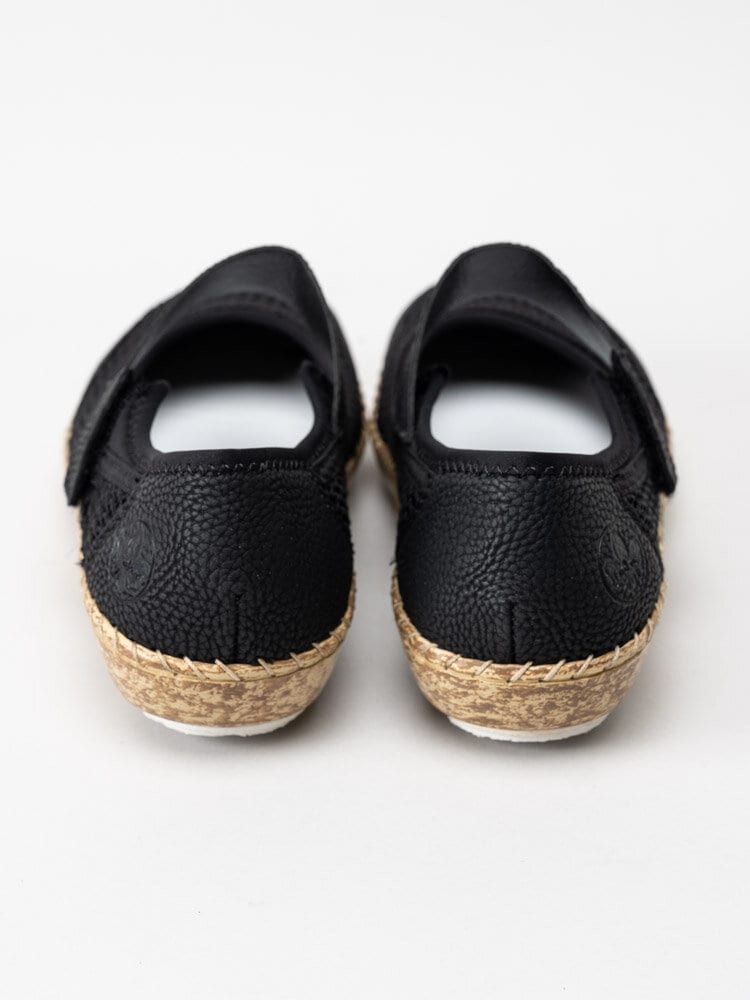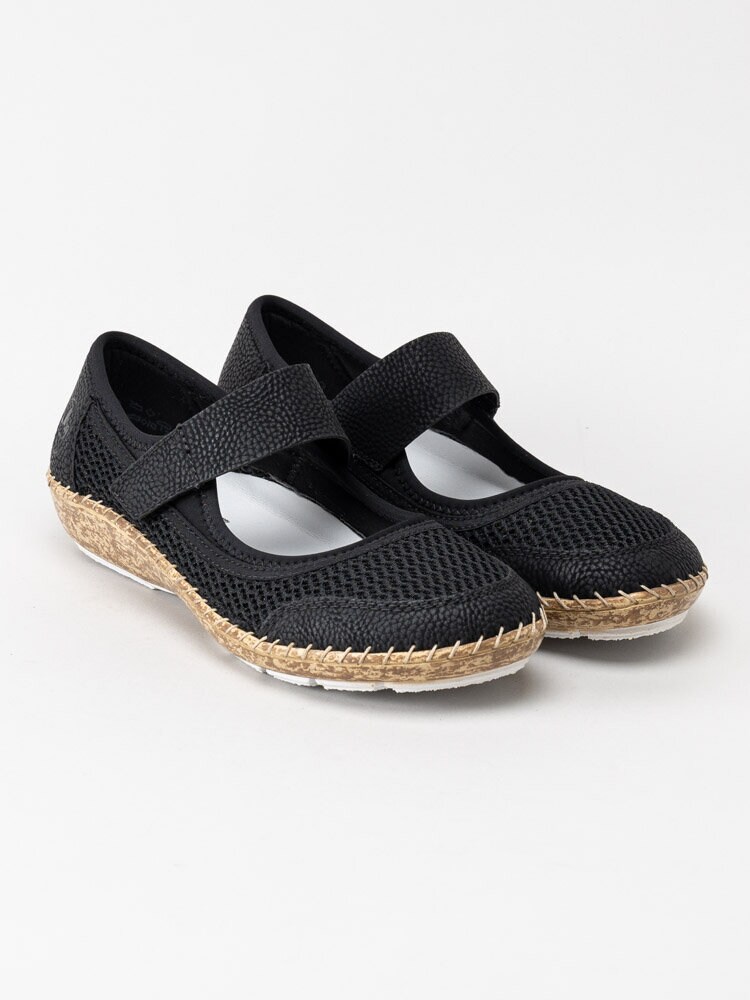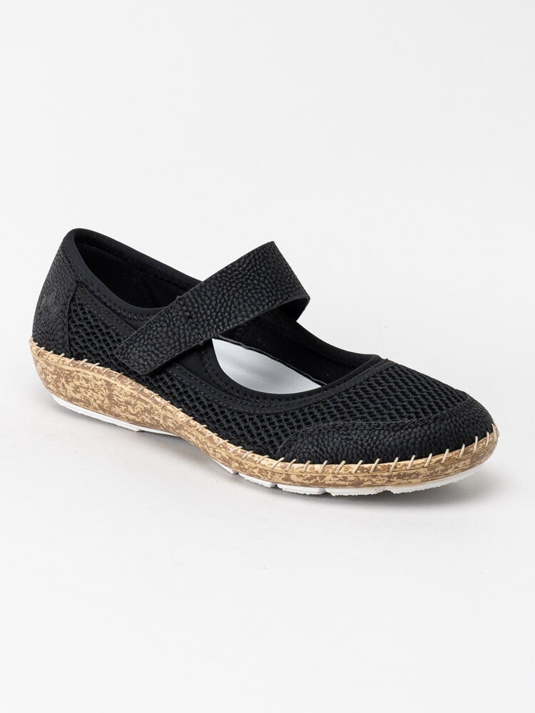 Svarta ballerinaskor från Rieker i textil. Sköna ballerinaskor i textil med detaljer i i syntet för att få stabilitet och en snygg look. Slejf med kardborreband som enkelt justeras efter din fot. Textilfodrade och med ljus innersula i skinn för en skön komfort. Tråcklad söm längs sulkant. Brun mellansula med vit slitsula i syntet. Bekväm och lätt sko både för inomhus bruk nu eller till sommaren.