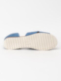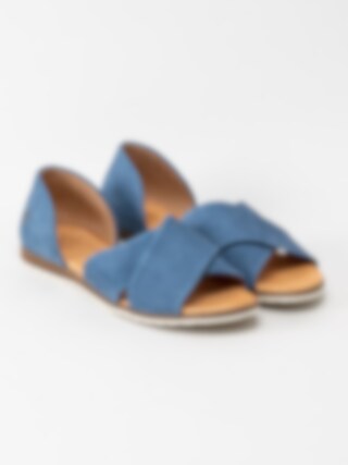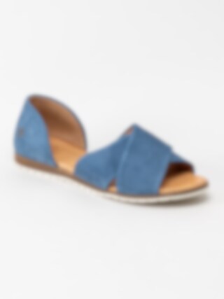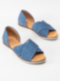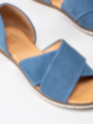 Ljusblå sandaler från Apple of Eden i mocka. Fina och dressade sandaler med korslagda band. Skinnfodrade med en mjuk innersula i skinn. Brun mellansula i korkimitation och vit yttersula i gummi med räfflat mönster.