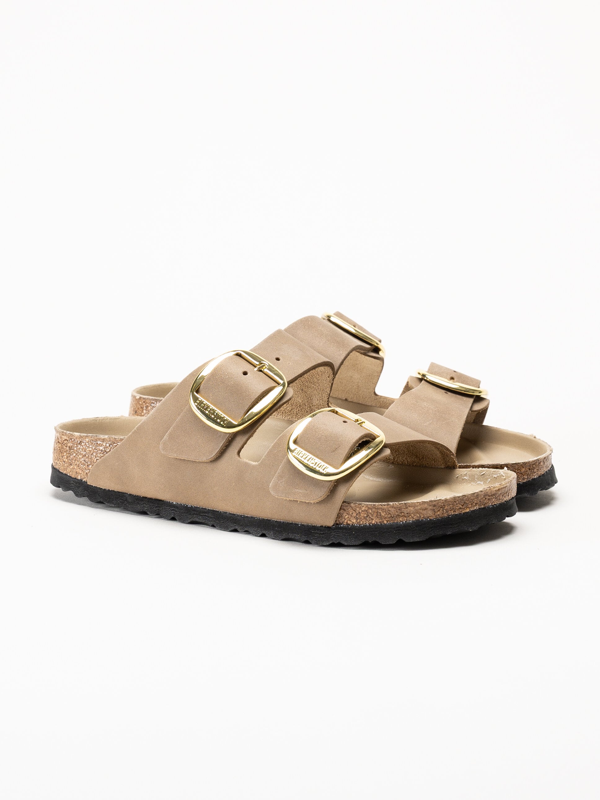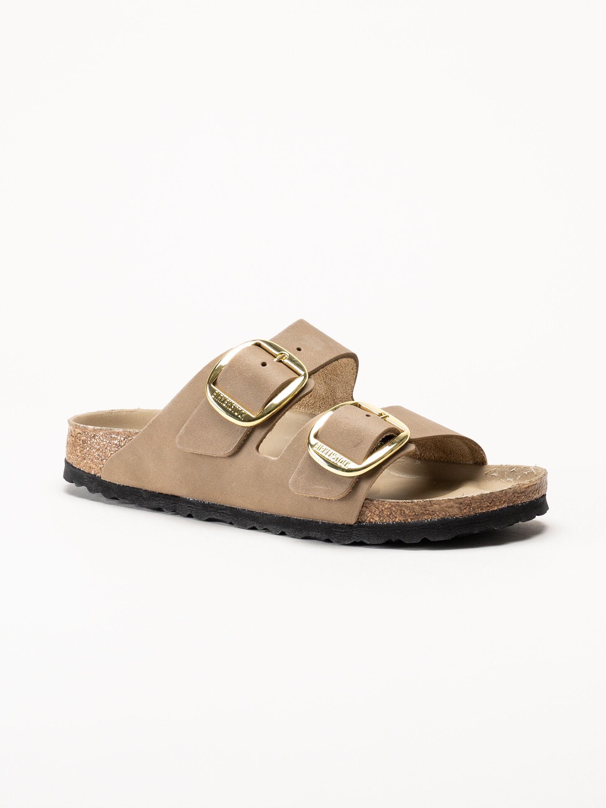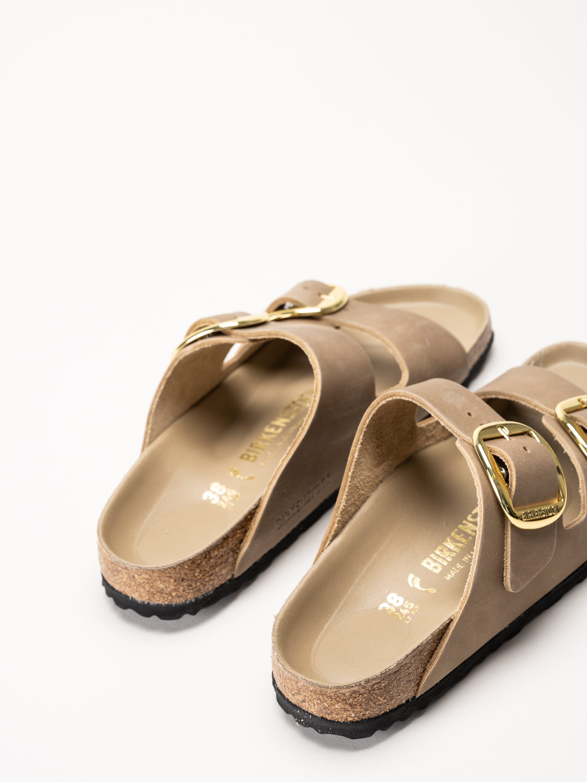 Beige slip-in sandaler Arizona Big Buckle från Birkenstock i färgen Tobacco Brown med en stilren och iögonfallande design. Ovandelen är tillverkad i oljat skinn som ger ett naturligt uttryck och utvecklar en vacker patina över tid. Modellen har två remmar med stora justerbara guldspännen som ger både en dekorativ detalj och möjlighet att anpassa passformen efter foten.