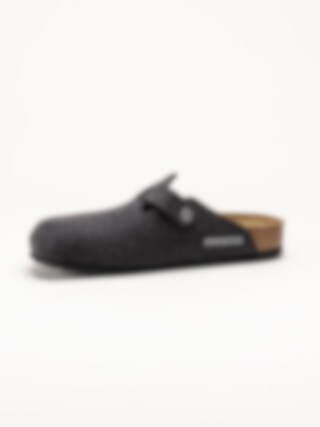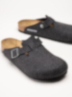 Mörkgrå slip-in sandaler Boston Wool Felt Regular Anthracite från Birkenstock. En äkta klassiker tillverkade i ull som kan användas året runt. Justerbar rem med ett individuellt justerbart metallspänne för optimal passform. Yttersula i syntet. Trendiga slip in tofflor som fungeerar både inom och utomhus.