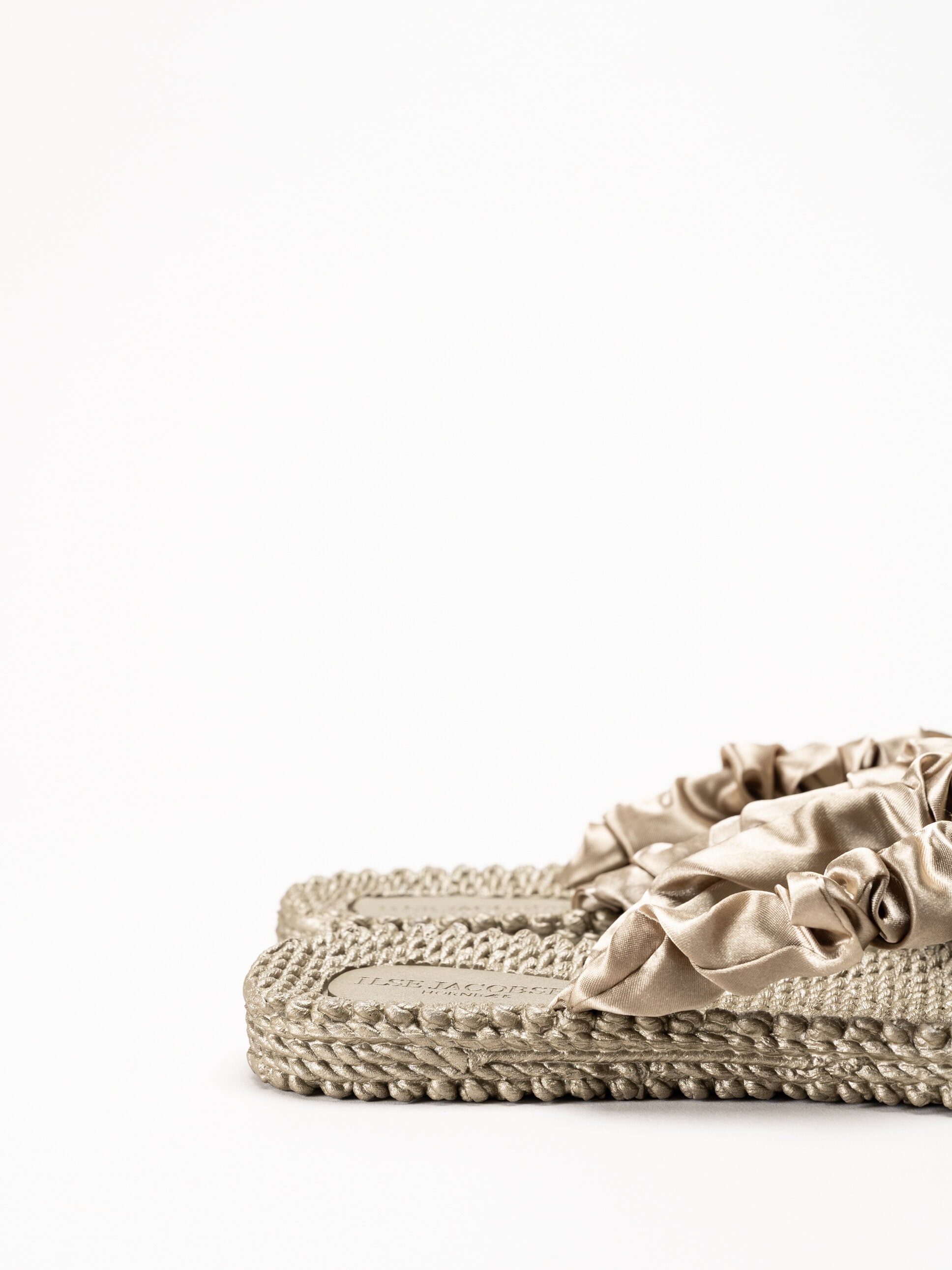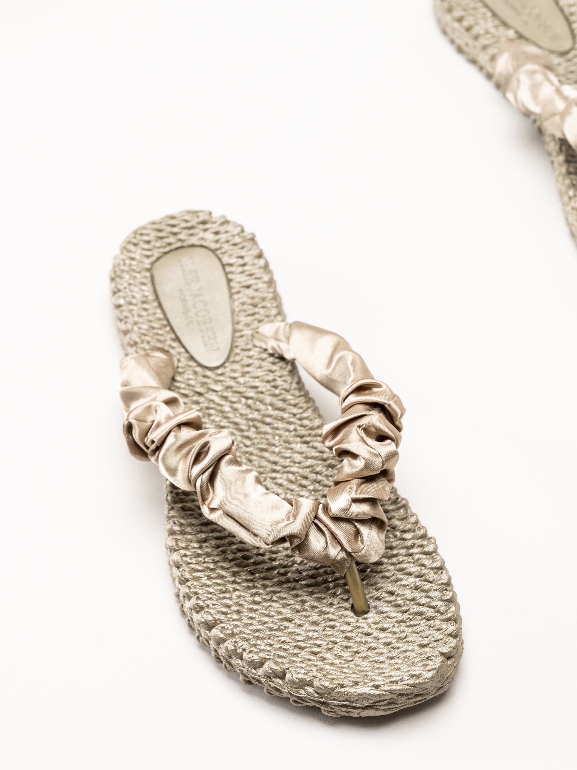 Guldfärgade flip flops Cheerful06 från Ilse Jacobsen med en färgstark och somrig design. Ovandelen är tillverkad i textil och har remmar klädda i ett mjukt, lätt glänsande material som ger ett elegant och feminint uttryck. Modellen har tådelare som ger en klassisk flip flop-passform och gör sandalerna enkla att ta på och av.
