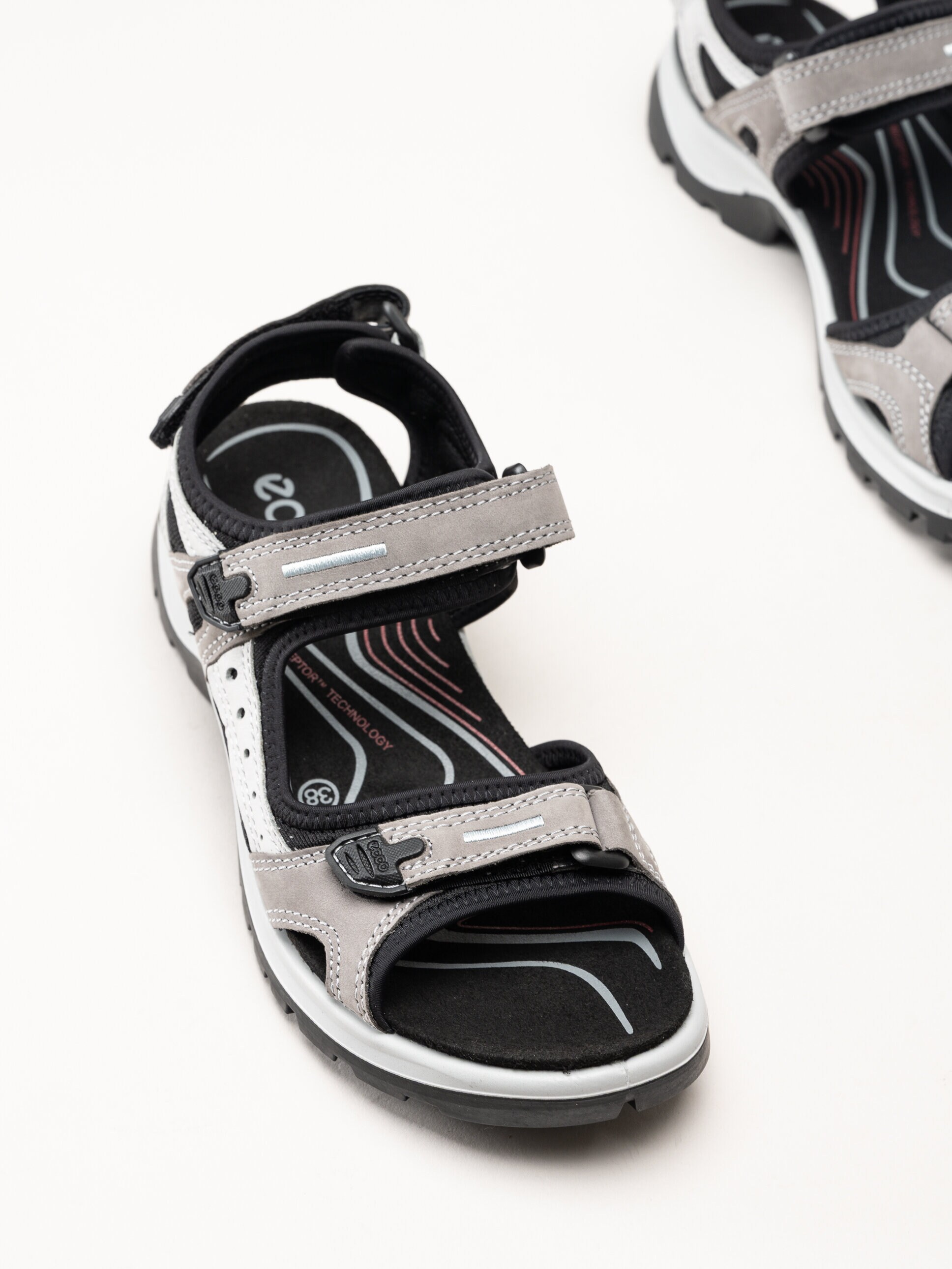 Invändigt är sandalerna fodrade med textil för ett behagligt fotklimat, och innersulan i textil ger mjuk komfort vid varje steg. Med Ecco Fluidform-teknologi och RECEPTOR®-teknologi får du stabilitet, naturligt stöd och effektiv stötdämpning, vilket gör sandalerna bekväma även under längre promenader.