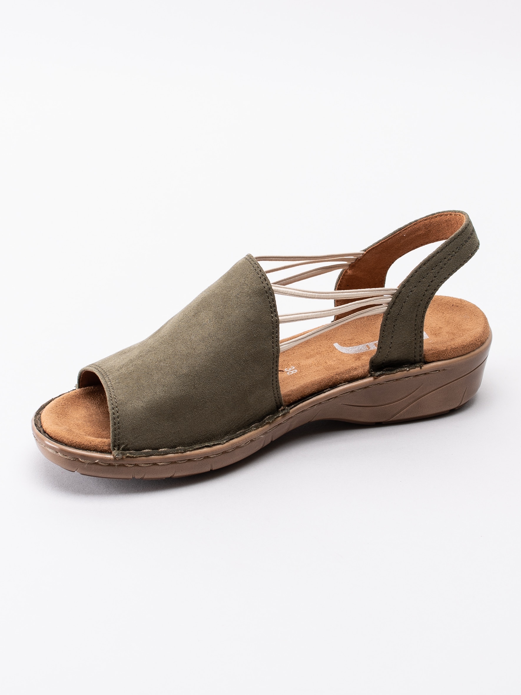 Mörkgröna sandaler från Jenny by Ara tillverkade i mockaimitation. Brett band över fot med öppen tå. Tre resårremmar på in- och utsidan som sitter ihop med en hälrem för lätt på- och avtagning samt för att hålla sandal på fot. Brunt foder och innersula i textil med sömlös logga i häl. Låg kilkack på ca 4 cm med platå på ca 2 cm. Brun yttersula i syntet med mönster.