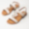 Beige sandaler 246MALDIVES i skinnimitation från Lunar. Fina sommarsandaler med dekorativa guldfärgade ringar som håller ihop vrist- och fotrem.