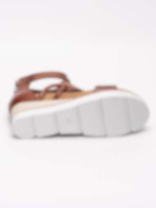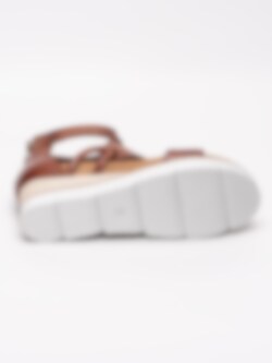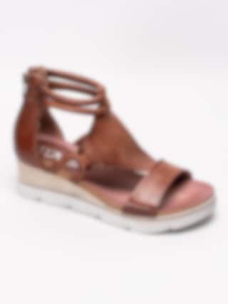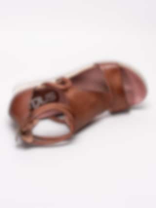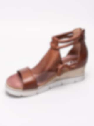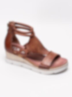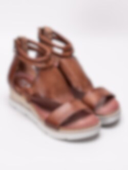 Bruna romarsandaler från Mjus tillverkade i skinn med perforerat mittenparti. Runda tjocka remmar i skinn runt vrist. Bronsfärgad dragkedja på bakparti som öppning. Brunt foder och innersula i skinn med präglad logga i silver. Brun rand längs sulkant som detalj. Klackhöjd på ca 6.5 cm med platå på ca 3 cm. Ljus yttersula i gummi med vågigt mönster.