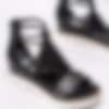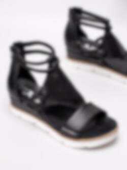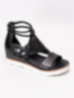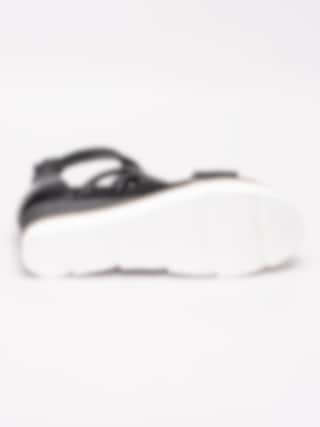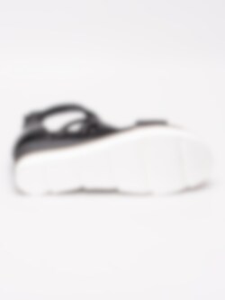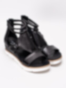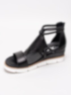 Svarta romarsandaler från Mjus tillverkade i skinn med perforerat mittenparti. Runda tjocka remmar i skinn runt vrist. Svart dragkedja på bakparti som öppning. Svart foder och innersula i skinn med präglad logga i silver. Brun rand i träimitation längs sulkant som detalj. Klackhöjd på ca 6.5 cm med platå på ca 3 cm. Vit yttersula i gummi med vågigt mönster.