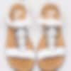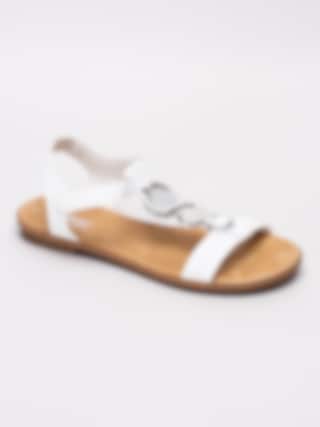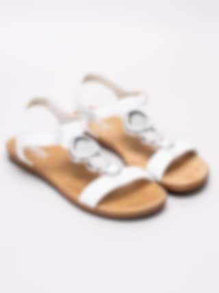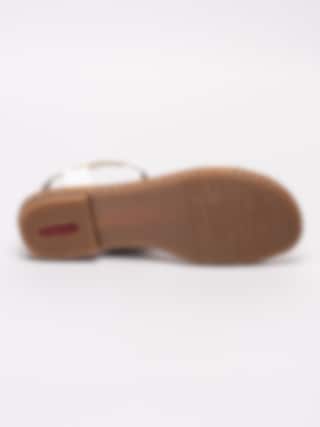 Vita sandaler från Rieker tillverkade i syntet med T-slejf. Tre dekorativa mynt i silver som detalj. Justerbar rem med kardborre som öppning. Vitt foder i syntet och beige innersula i textil med präglad logga i silver. Brun rand längs sulkant. Låg klack på ca 2 cm. Beige yttersula i syntet med mönster och präglad röd logga på häl.