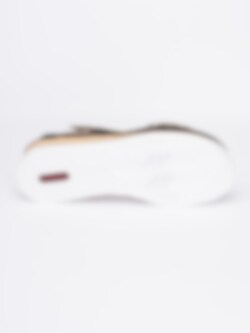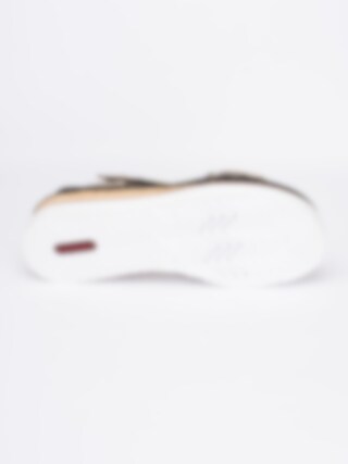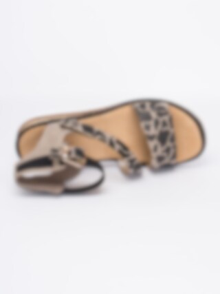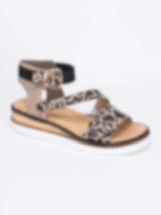 Beige sandal från Rieker i syntet med ko-mönster. Resårrem runt vrist med ett guldspänne som detalj. Frontrem och rem över fot går att justera med karborre. Foder i syntet och innersula i textil. Svart rand med ljus söm och brun skinnimitaion längs sulkanten. Klack med träimitation och vit yttersula i syntet.