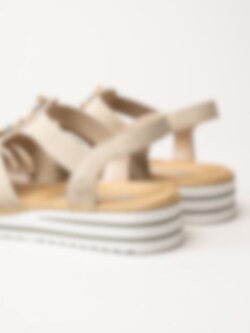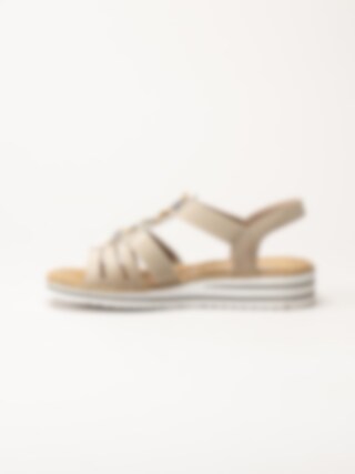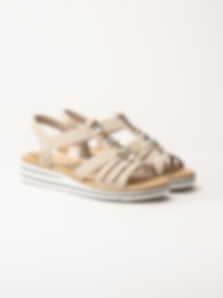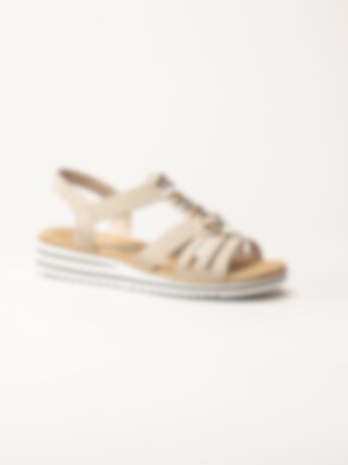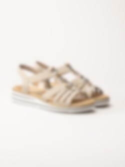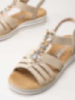 Beige sandaletter från Rieker med en elegant och bekväm design. Ovandelen är tillverkad i en kombination av syntet och textil och pryds av en dekorativ pärldetalj som ger ett feminint uttryck. Modellen har fasta remmar och resårpartier som gör den enkel att ta på och av samt ger en flexibel och bekväm passform. Den lilla kilklacken ger en behaglig höjd och en stabil gång.
