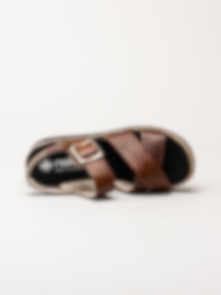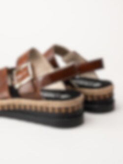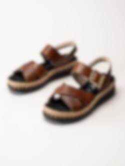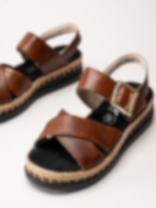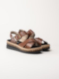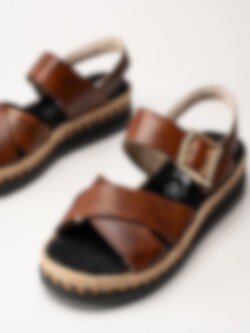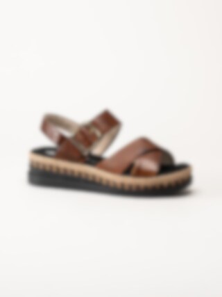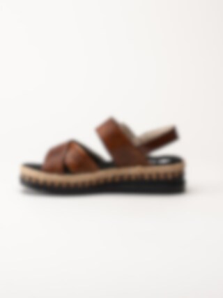Bruna platåsandaler från Rieker från Peanut med en modern och bekväm design. Ovandelen är tillverkad i skinn och har korslagda remmar som ger ett stilrent och följsamt uttryck. Modellen har ett justerbart guldspänne som gör det enkelt att anpassa passformen efter foten, samtidigt som det tillför en elegant detalj. Platåsulan ger en bekväm höjd och bidrar till en stabil och skön gång.