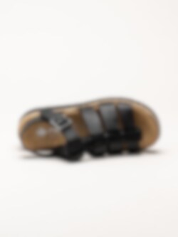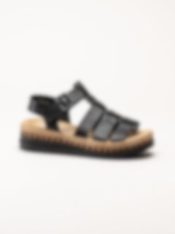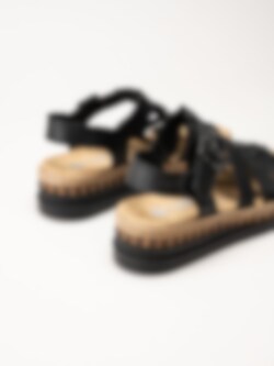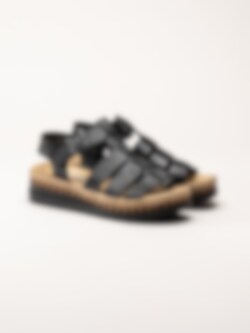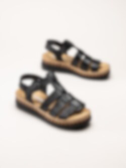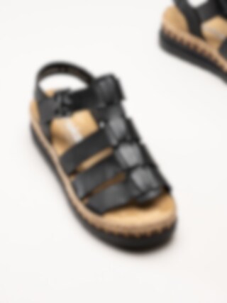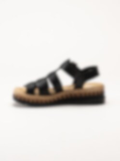 Svarta sandaler i skinn från Rieker. Sandalerna är tillverkade i mjukt skinn som ger en stilren och tidlös look samtidigt som materialet formar sig behagligt efter foten. De klassiska remmarna tillsammans med ett justerbart spänne gör det enkelt att anpassa passformen för optimal komfort. Den snygga kilsulan med korkinspirerat mönster och repdetalj ger en somrig och trendig känsla samtidigt som den ger behaglig höjd.