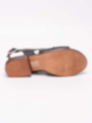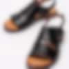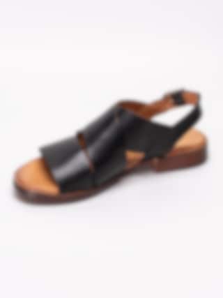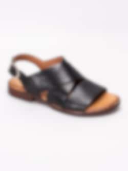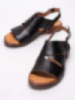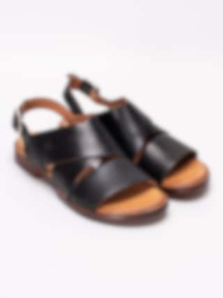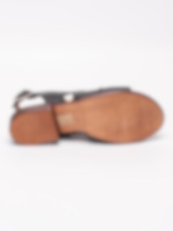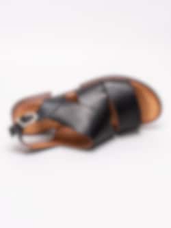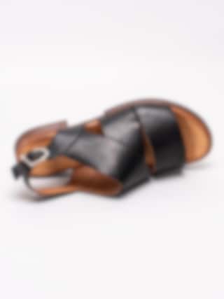 Svarta sandaler från Rosa Negra tillverkade i skinn med breda och korslagda band. Mjukt skinn som omsluter foten som en handske. Hälrem i skinn med spänne i silvermetall för att anpassa passformen. Brunt foder och innersula i skinn med mjuk fotbädd. Låg klack i träimitation på ca 2.5 cm. Brun yttersula i syntet med slät yta.