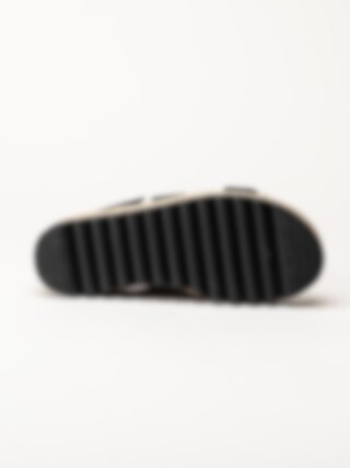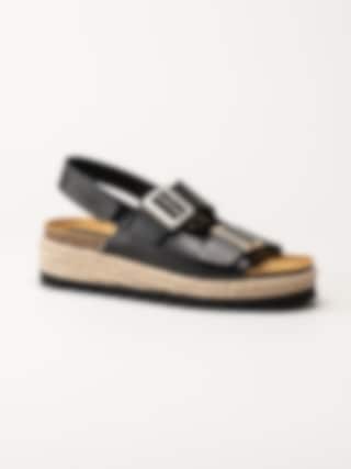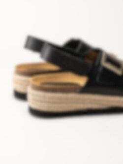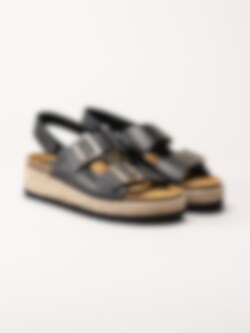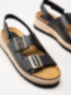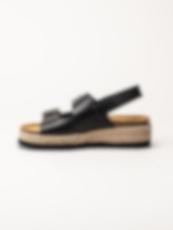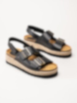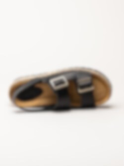 Svarta sandaler Sonja i skinn från Sweeks. Snygga sandaler med två remmar över foten, reglerbara spännen och en hälrem som knäpps med velcro. Vadderad innersula med extra förstärkning vid hälen, repklädd mellansula som en snygg touch, och vit vågig yttersula. Präglad logotyp på utsidan. En av våra sommarfavoriter som passar lika bra till jobbet som till festen!