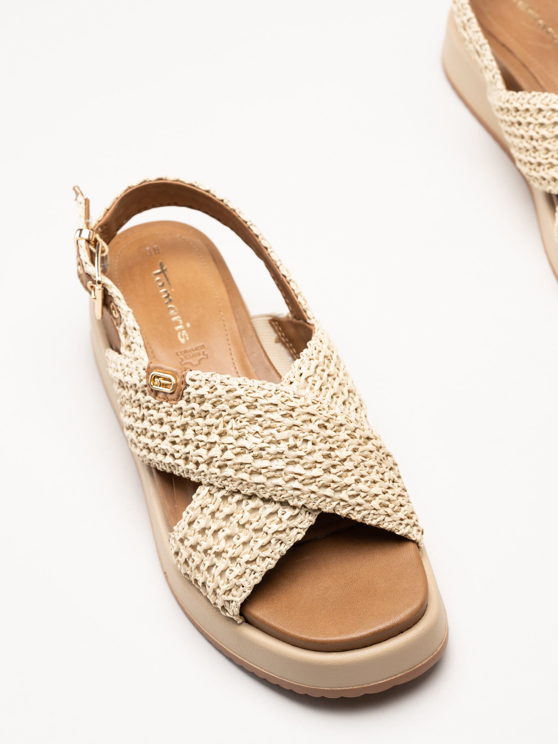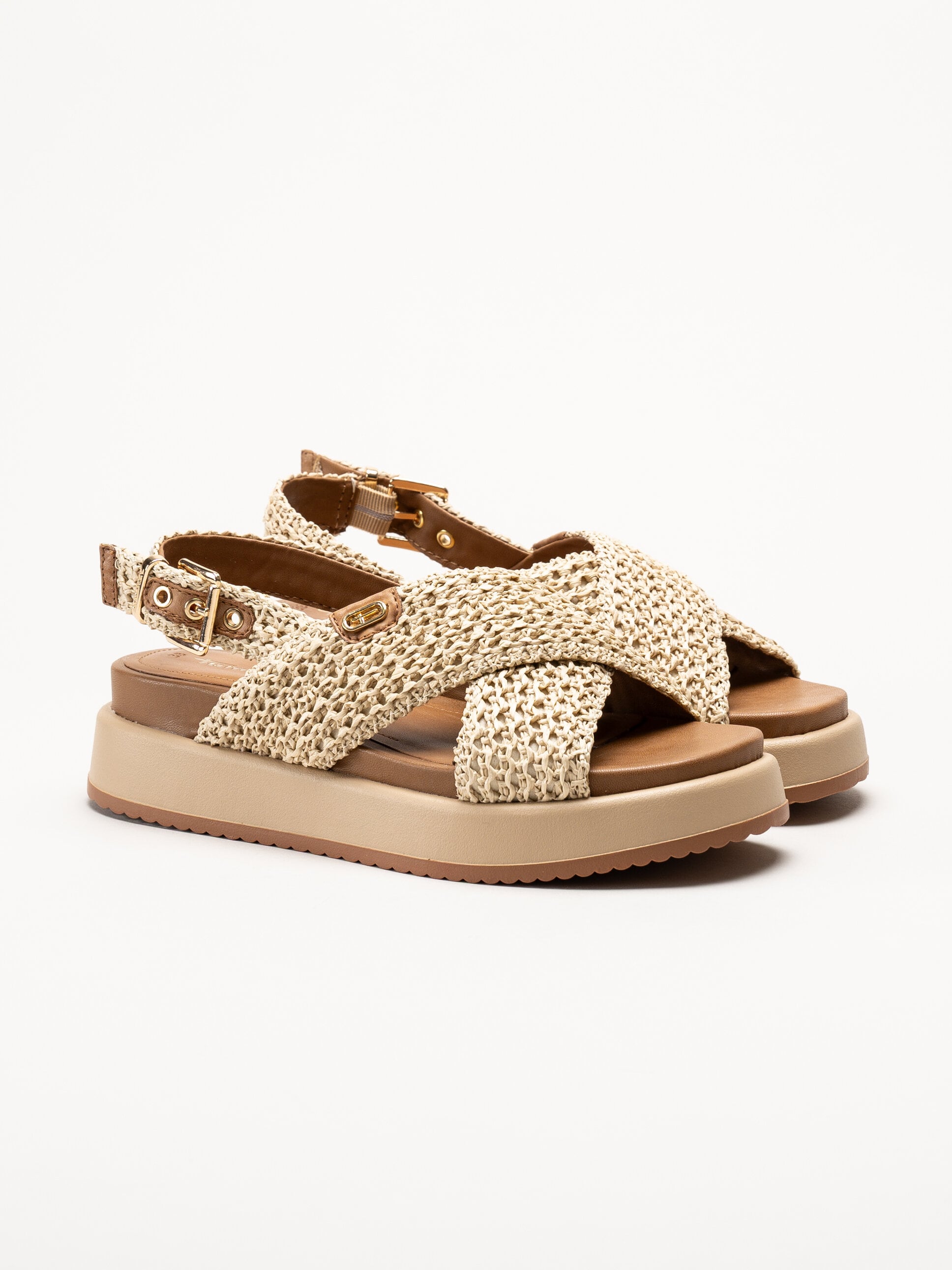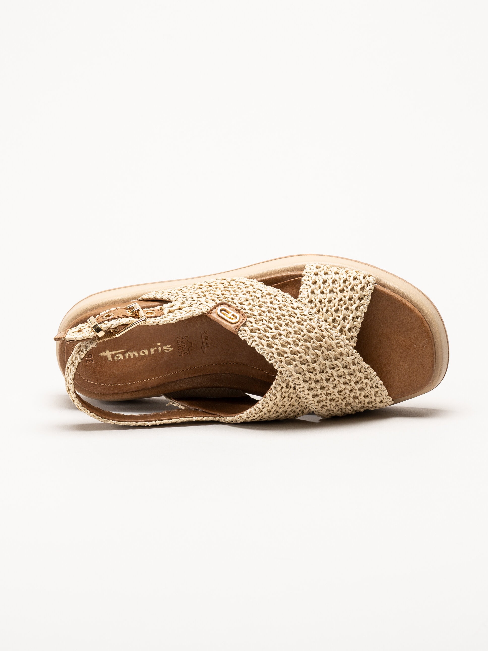 Beige sandaler från Tamaris med en stilren och somrig design. Ovandelen är tillverkad i raffia som ger ett naturligt och trendigt uttryck. Modellen har korslagda remmar framtill som skapar en elegant siluett, samt en justerbar rem baktill som gör det enkelt att anpassa passformen efter foten. Den lilla platåsulan bidrar till en bekväm höjd och en stabil gång.
