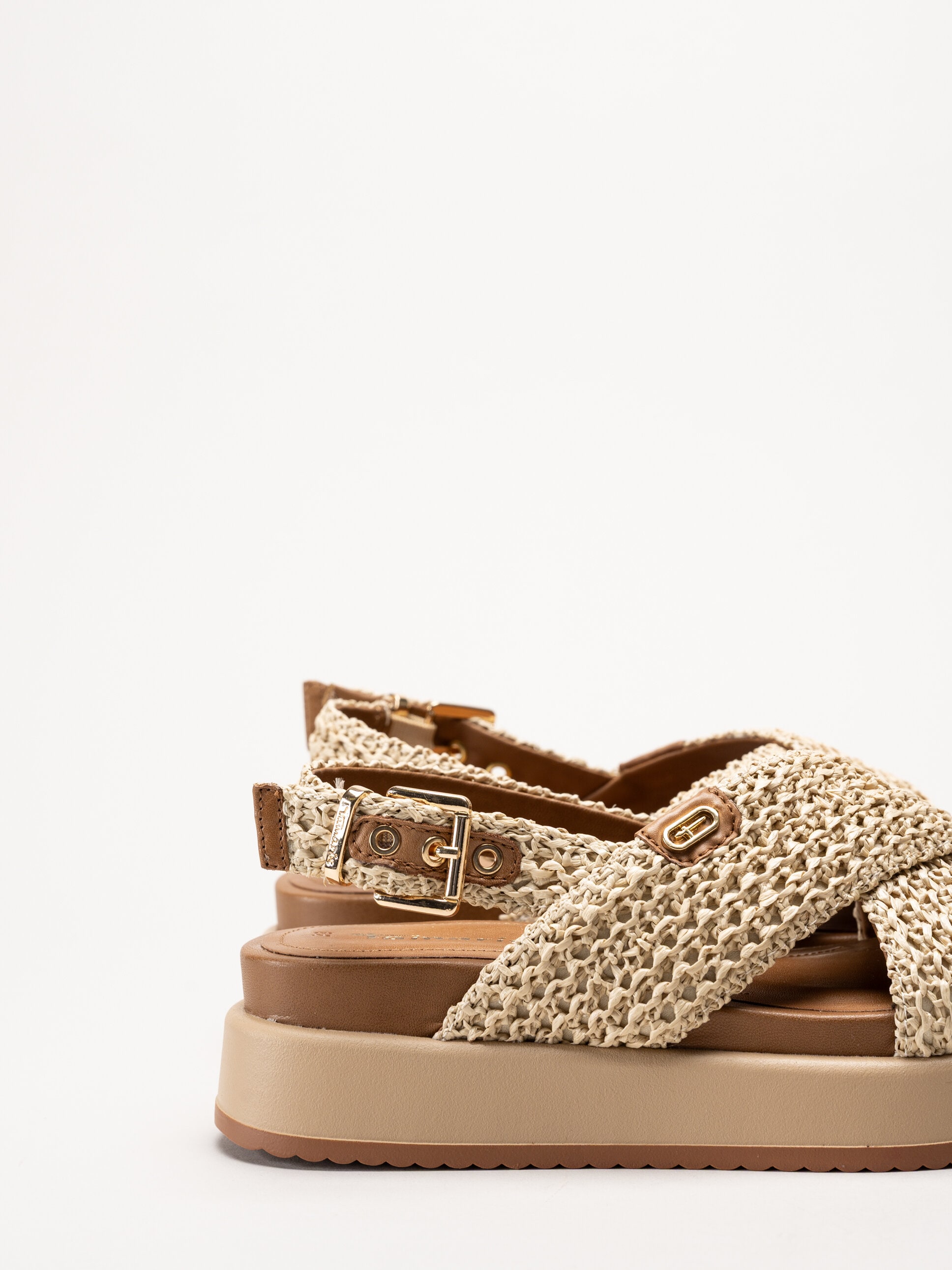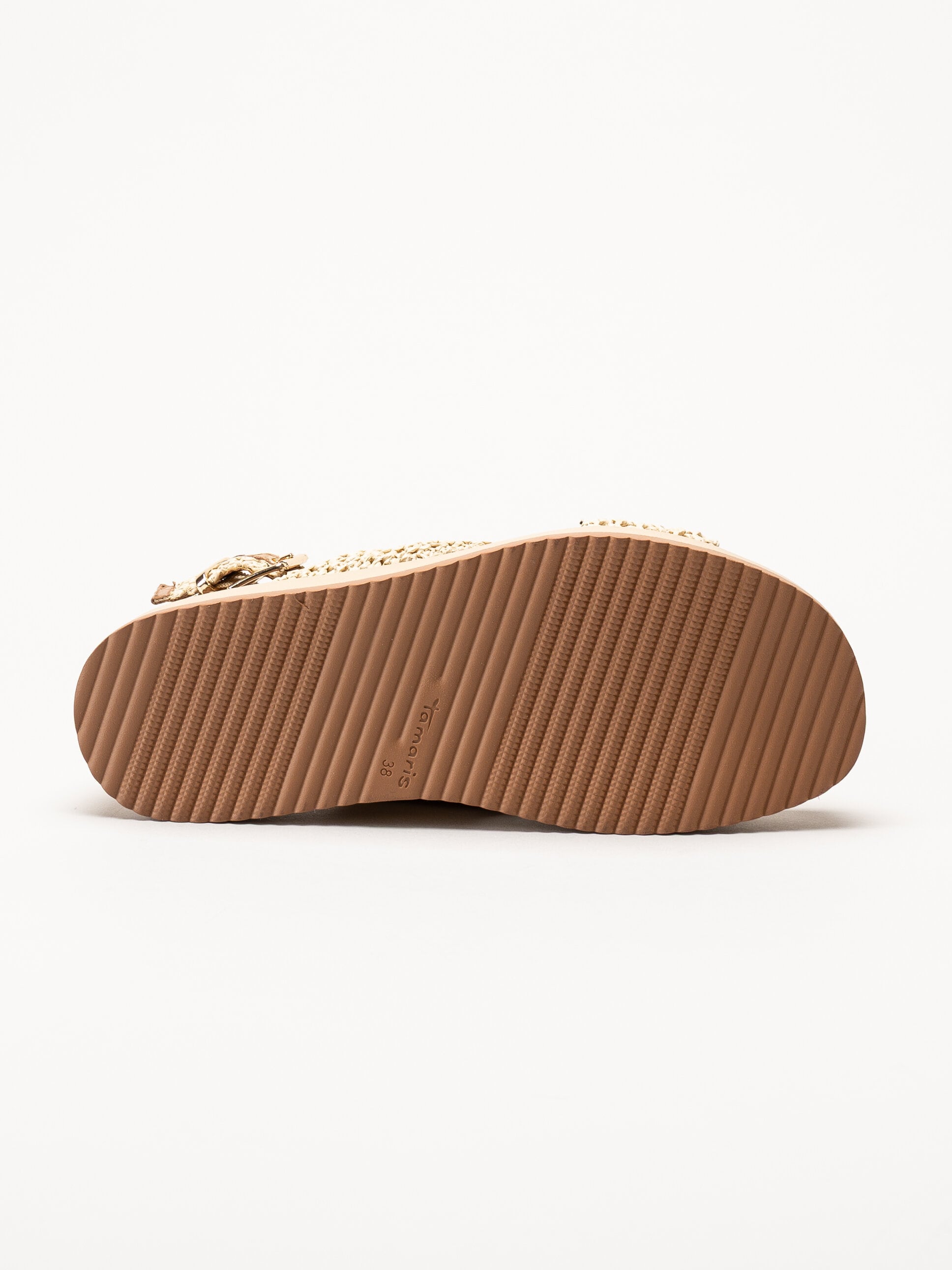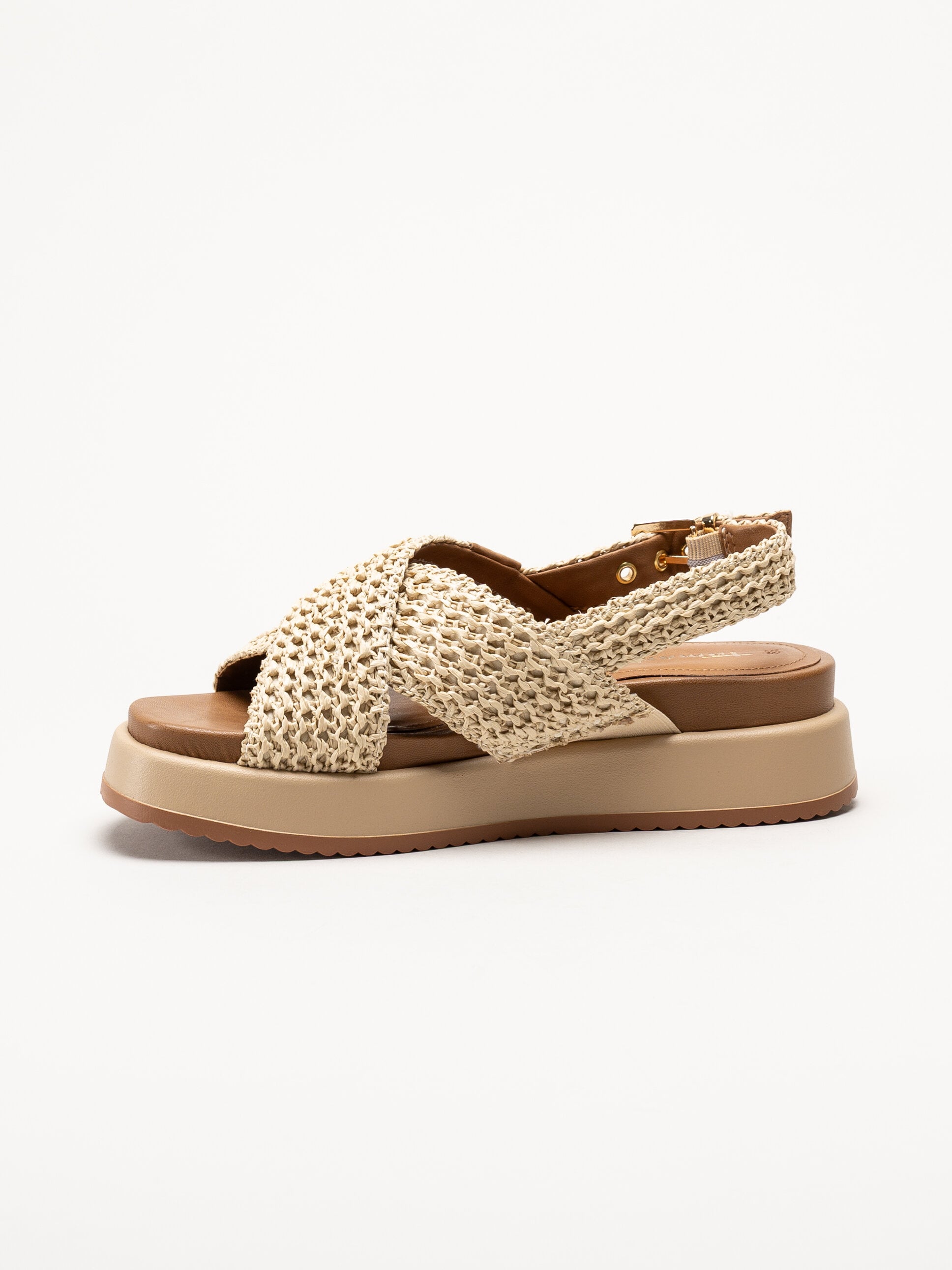 Beige sandaler från Tamaris med en stilren och somrig design. Ovandelen är tillverkad i raffia som ger ett naturligt och trendigt uttryck. Modellen har korslagda remmar framtill som skapar en elegant siluett, samt en justerbar rem baktill som gör det enkelt att anpassa passformen efter foten. Den lilla platåsulan bidrar till en bekväm höjd och en stabil gång.
