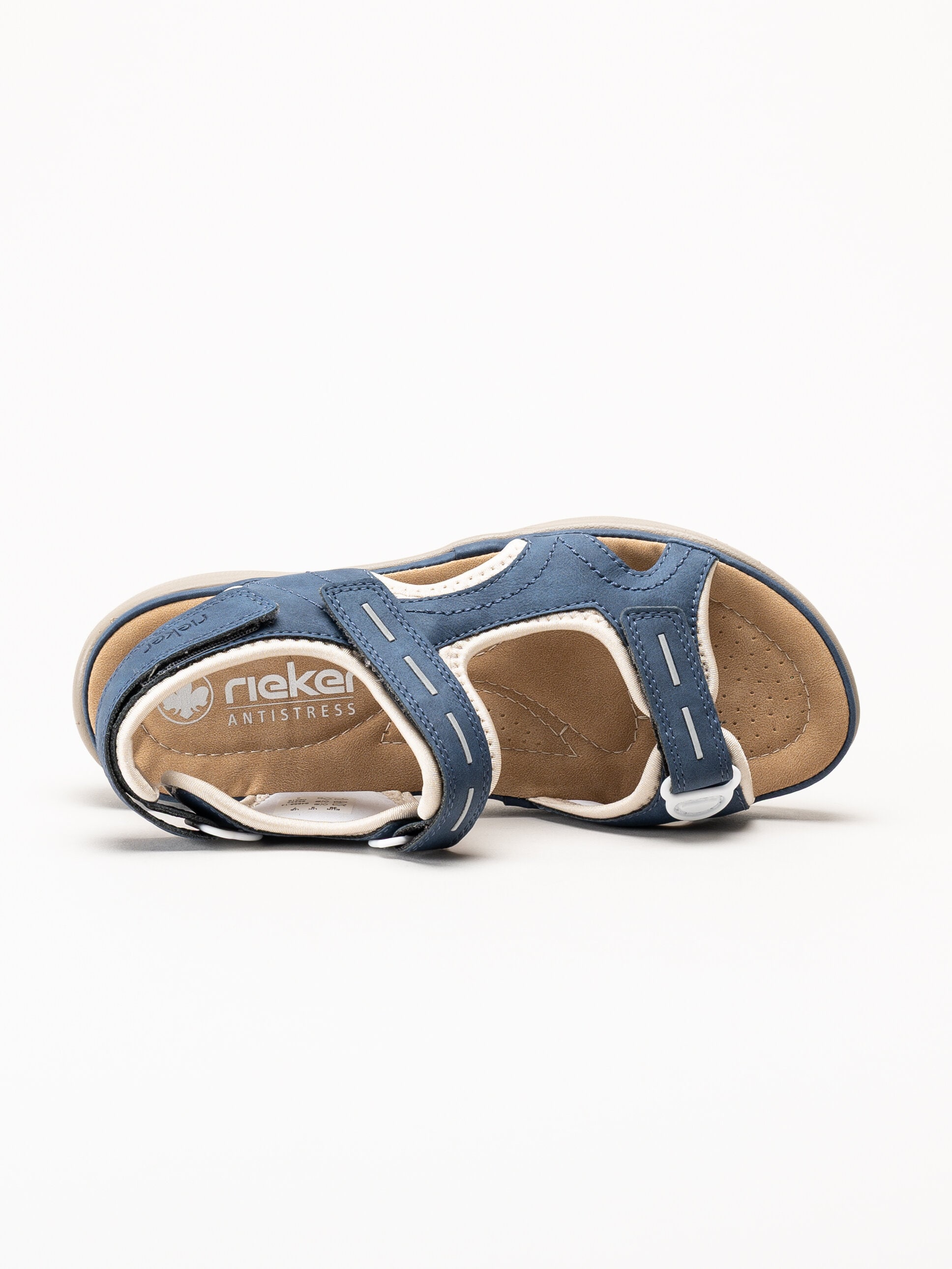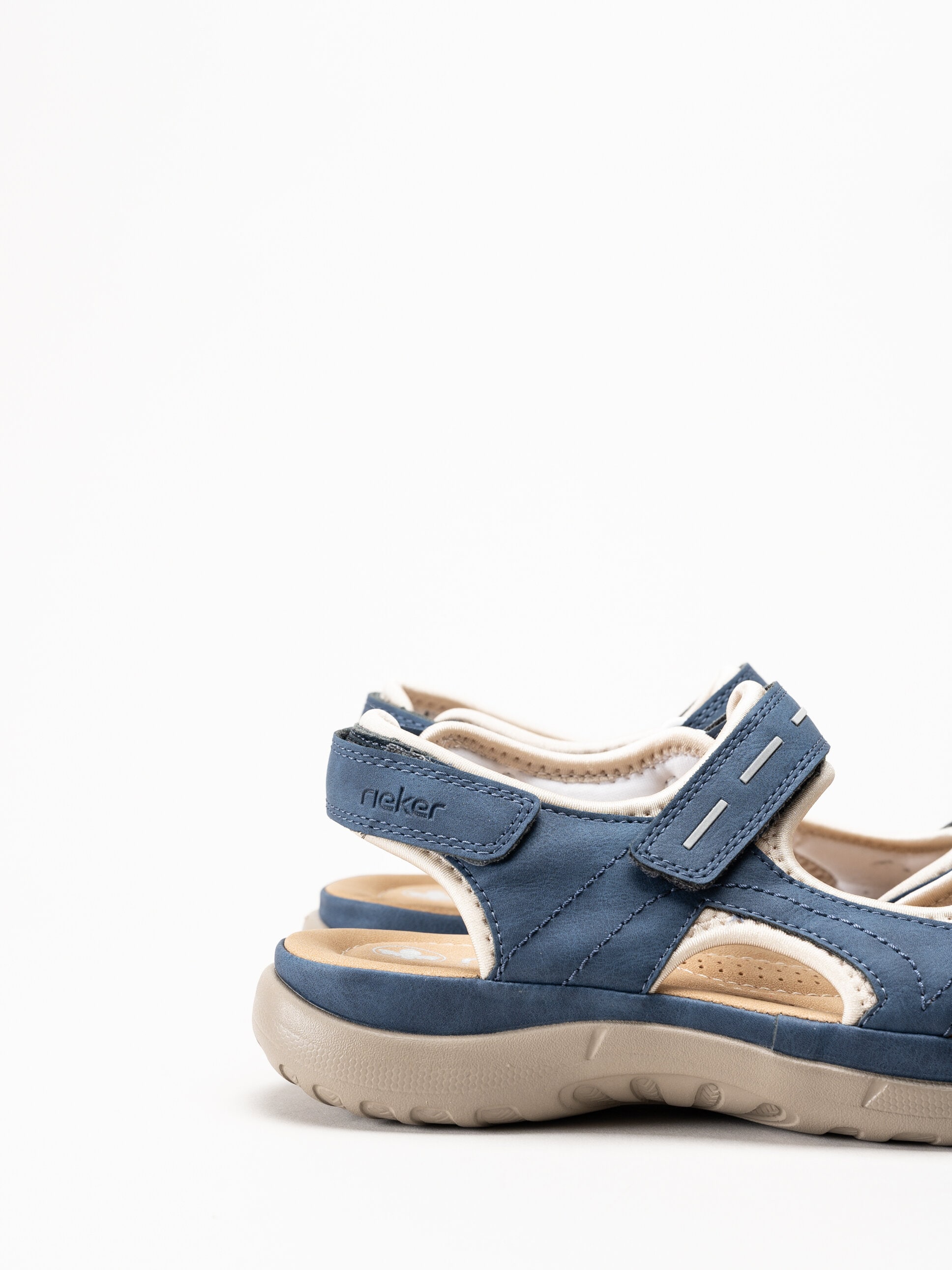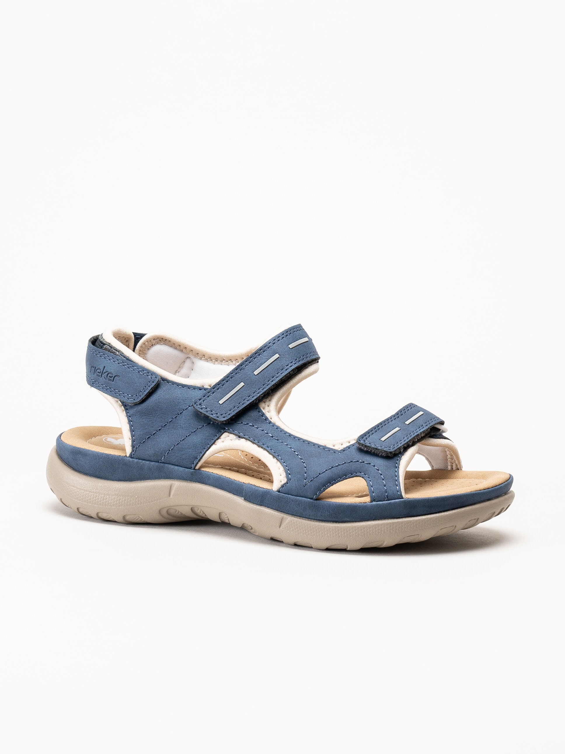 Blå remsandaler från Rieker i färgen Blue med en lätt och bekväm design. Ovandelen är tillverkad i syntet och ger ett följsamt och slitstarkt uttryck. Modellen har flera kardborrespännen, även baktill vid hälen, vilket gör det enkelt att justera passformen för optimal komfort och stöd.