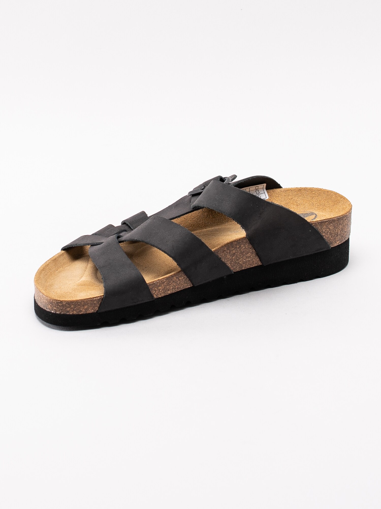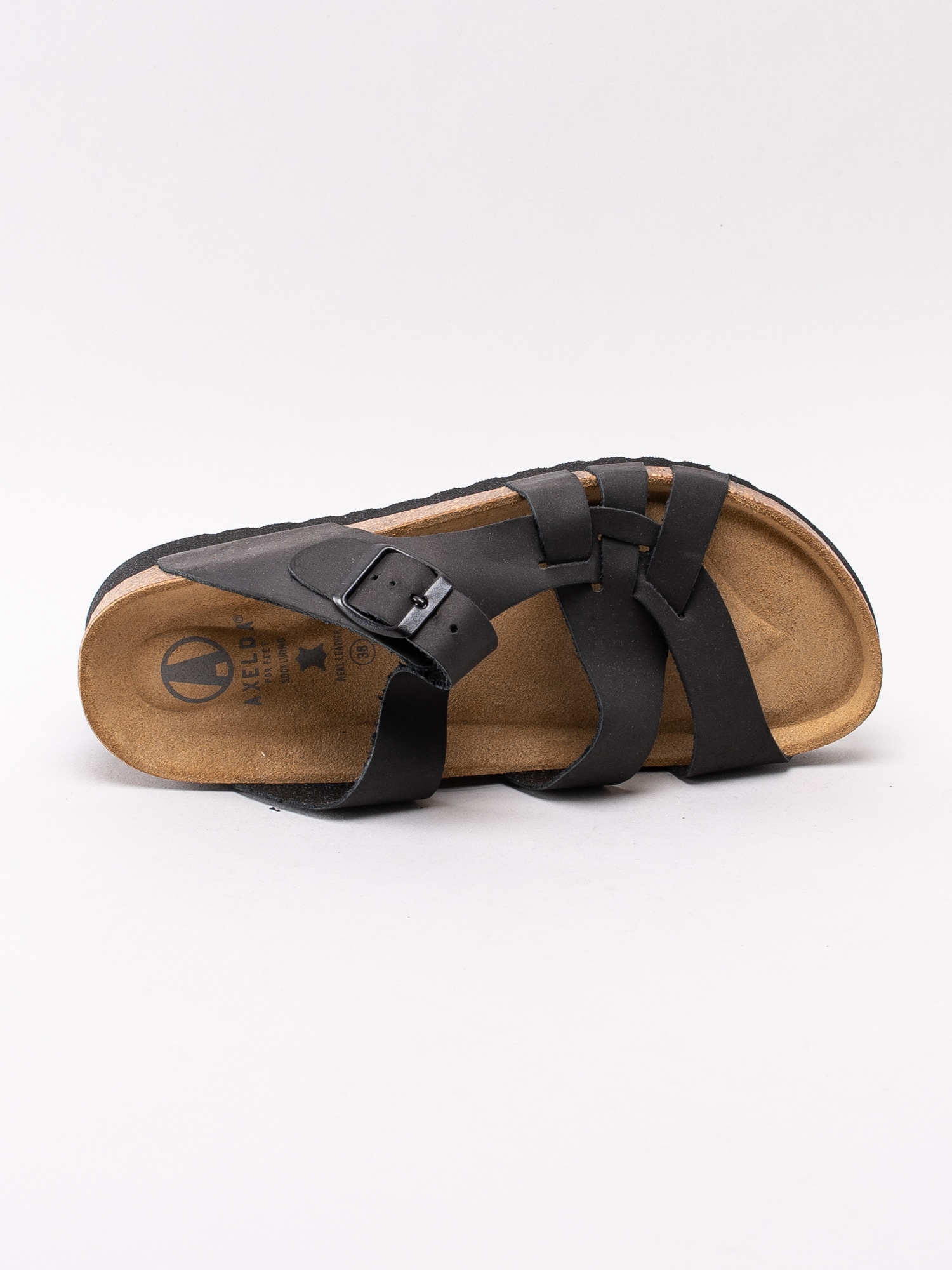Svarta slip in sandaler Victoria från Axelda. Tillverkade i oljad nubuck med flätad framdel. Enkla att sätta på med en urskålning för att hålla foten på plats. Lagom kilklack för dig som önskar en lutning. Anatomiskt formad och mjuk sula som passar till dig som går och står mycket. Svart spänne i metall för att kunna anpassa passformen över fot. Svart yttersula i syntet för att inte vara känslig mot olika underlag.