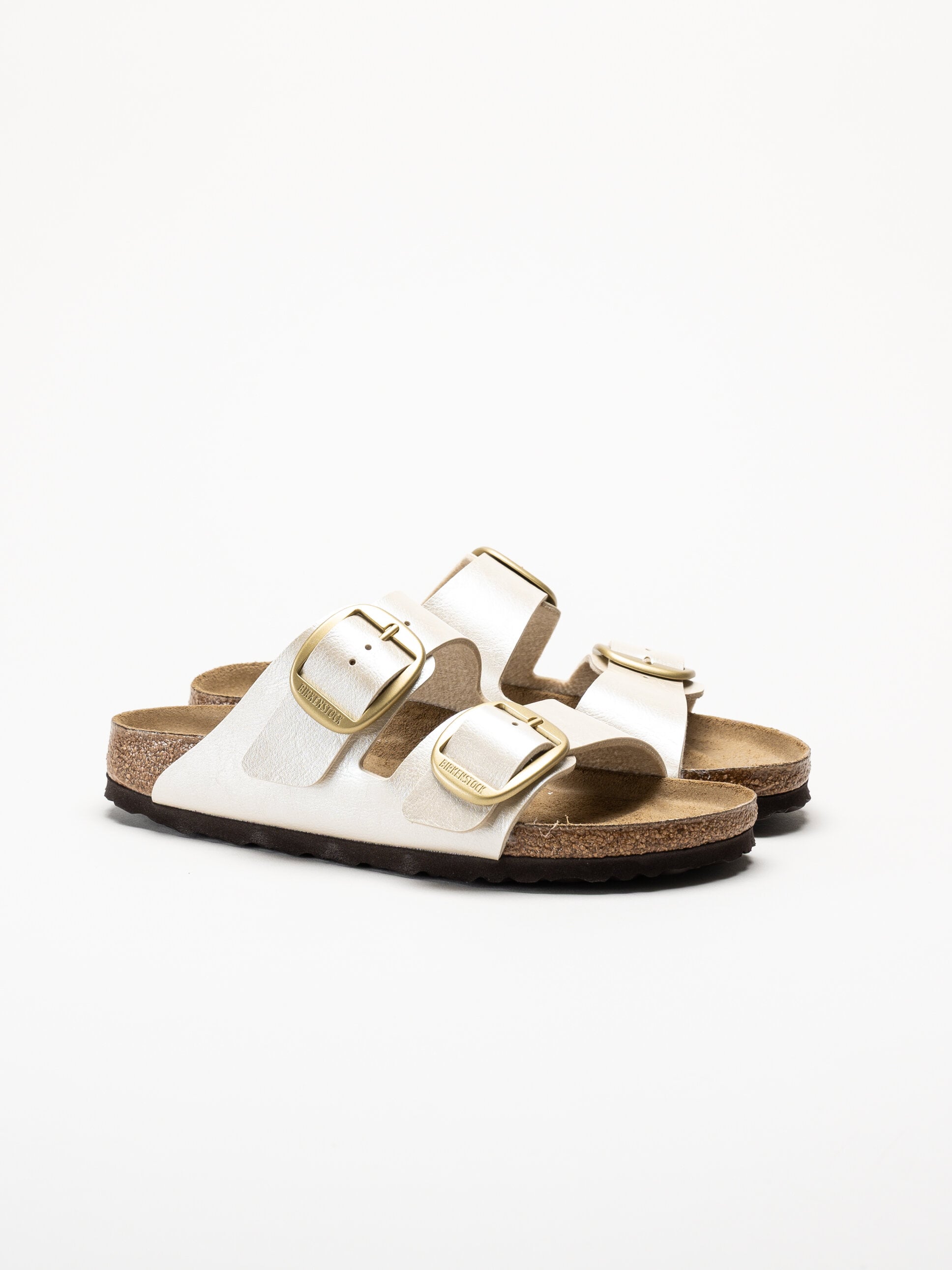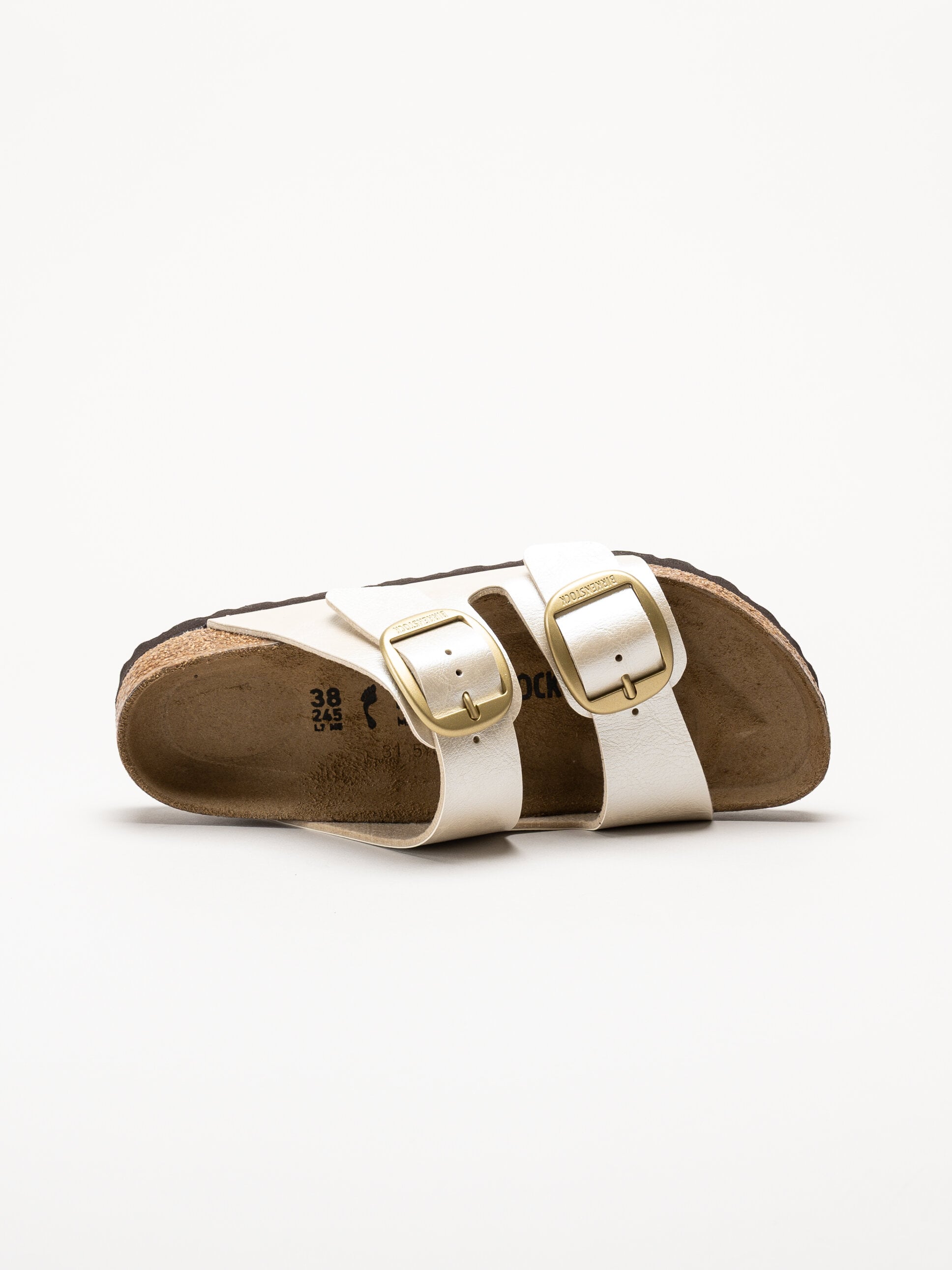 Beige skimrande slip-in sandaler Arizona Big Buckle från Birkenstock i färgen Pearl White. Skorna är tillverkade i syntet, Birko-Flor som ger ett lätt och hållbart uttryck, med textilfoder för extra komfort. Modellen har stora guldfärgade spännen i metall som enkelt kan justeras för en individuell passform. Den ergonomiskt formade innersulan i mocka och kork ger bra stöd, och den skålformade sulan omsluter foten på ett behagligt sätt.