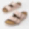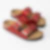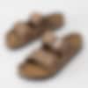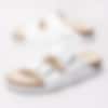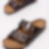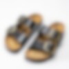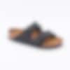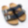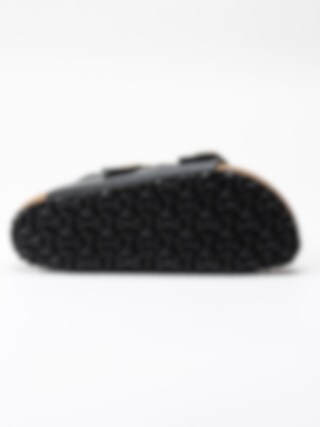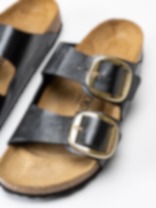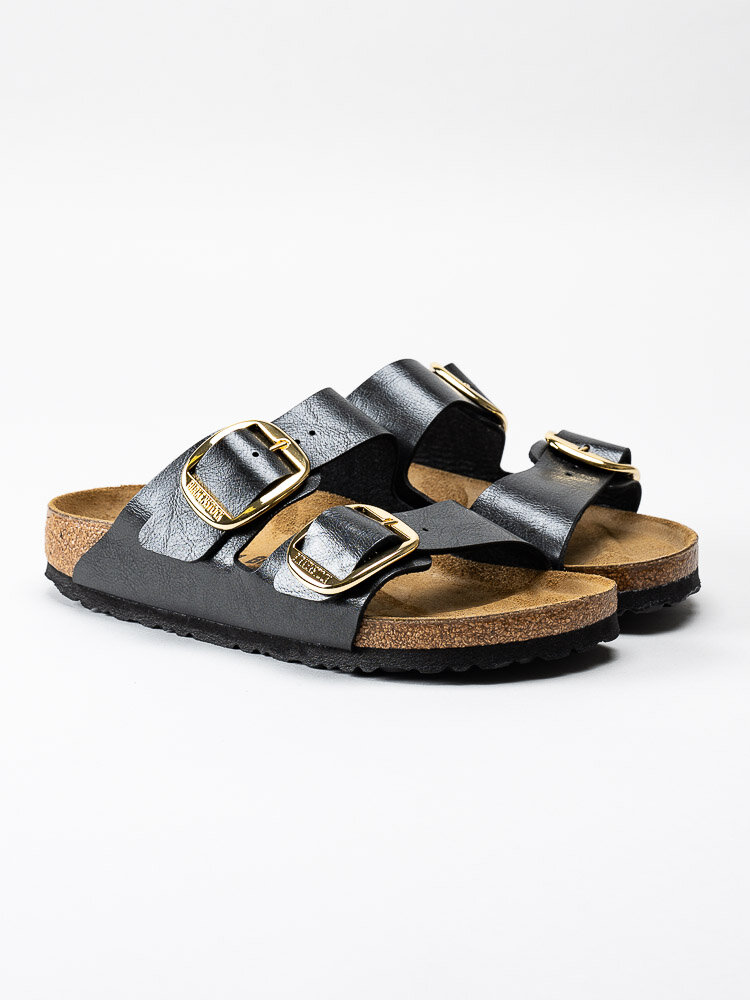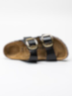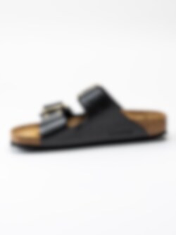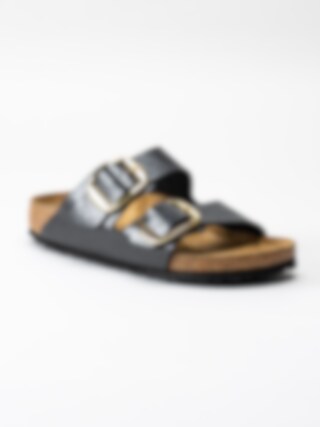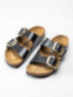 Svarta slip in sandaler Arizona Big Buckle från Birkenstock tillverkade i syntetmaterialet Birko-Flor® som är både hudvänligt och slitstarkt. Klassisk modell med stora mässingsfärgade spännen i metall för att justera till individuell passform. Använd antingen som innetofflor för att skydda fötterna mot hårda golv eller som en slip in sandal att matcha med den lediga sommarlooken. Tack vare den ergonomiskt formade sulan får du stöd och den skålformade sulan ger en känsla av omfamning. Designad med en normal fotbädd och smal läst för dig som har en smal till normal-bred fot. Mellansula i kork med svart yttersula i syntet.