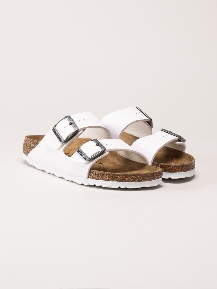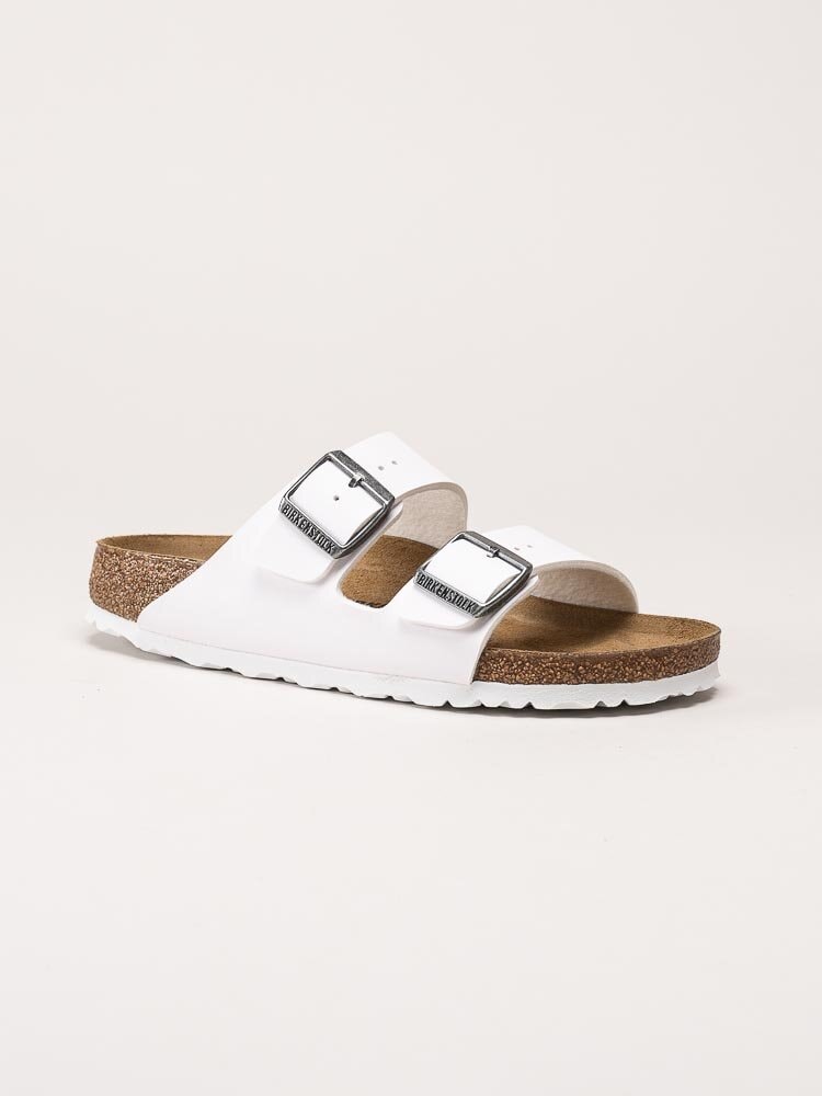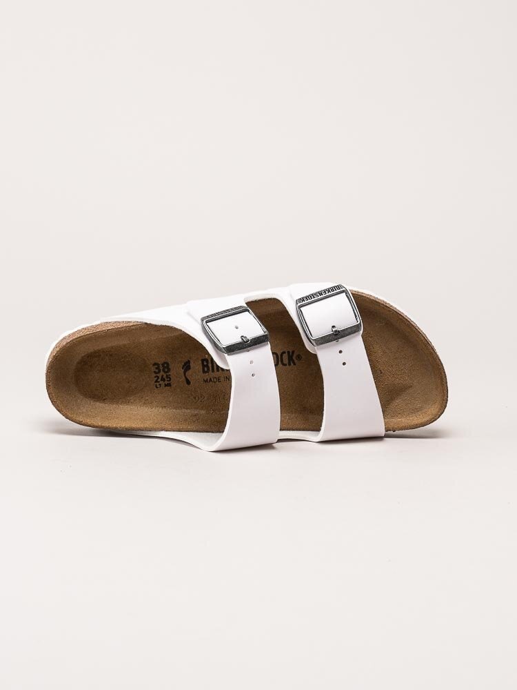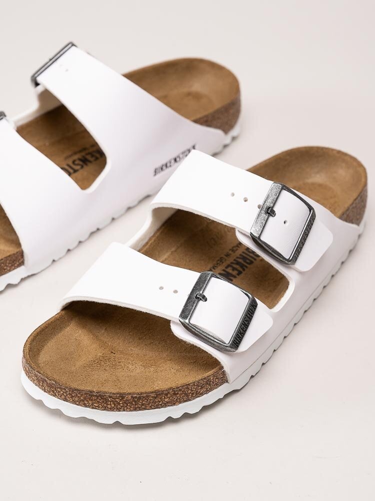 Vita slip-in sandaler Arizona Birko-Flor från Birkenstock. Sandalerna är tillverkade i slitstarkt och lättskött syntetmaterial (Birko-Flor) som ger ett stilrent och tidlöst uttryck. De två justerbara remmarna över foten gör det enkelt att anpassa passformen för optimal komfort.