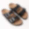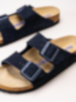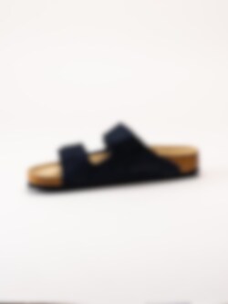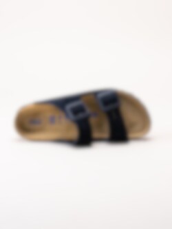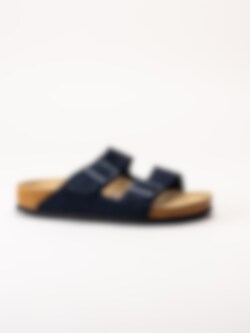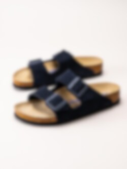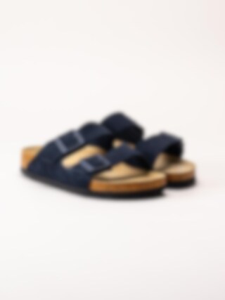 Mörkblå slip in sandaler Arizona SFB från Birkenstock i mocka. En riktig klassiker och en svårslagen favorit hos både kvinnor och män sedan årtionden tillbaka. Utrustad med mjuk fotbädd och smal läst för dig som har en smal till normal-bred fot. Två justerbara remmar med mörkblå spännen som öppning. Brun innersula i mocka med mjuk latexbotten och integrerad permanent elastisk latexkudde för riktigt skön komfort. Mellansula i kork och svart yttersula i EVA med mönster.