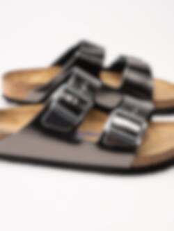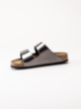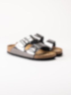 Gråmetallic slip in sandaler från Birkenstock, Arizona Soft Footbed. Två justerbara remmar med spännen i silverfärgad metall för att anpassa passform. Den anatomiska fotbädden av äkta naturkork ger din fot rätt stöd och med hjälp av ett extra lager av latex får din fot en extra mjuk dämpning.