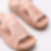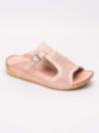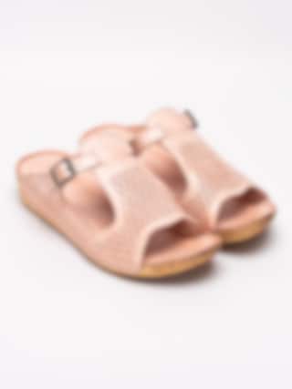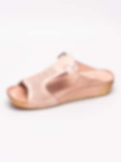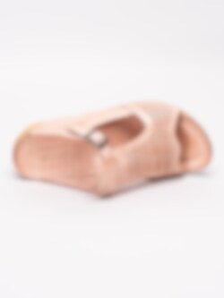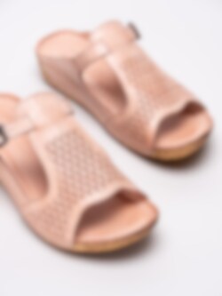 Rosa sandaler från Rosa Negra tillverkade i mjukt följsamt skinn med präglat mönster på ovandel. Slip in modell med justerbar rem med spänne i metall för att anpassa passformen. Uppbyggd hålfot för att ge extra stöd. Rosa foder och mjuk innersula i skinn med präglad logga i hälen. Kilklack på ca 3.5 cm med platå på ca 2 cm. Gul yttersula i syntet i korkimitation med slät yta.