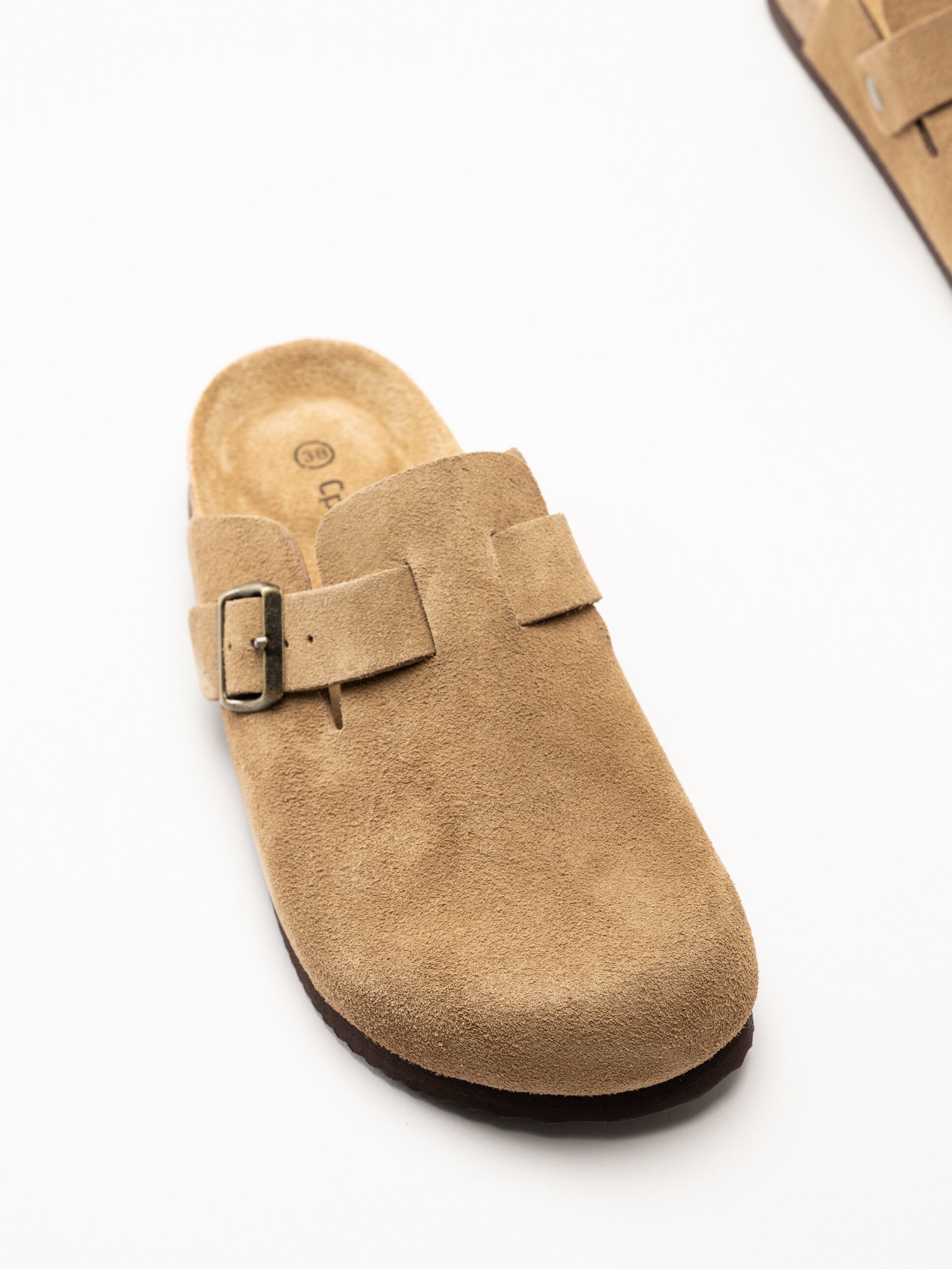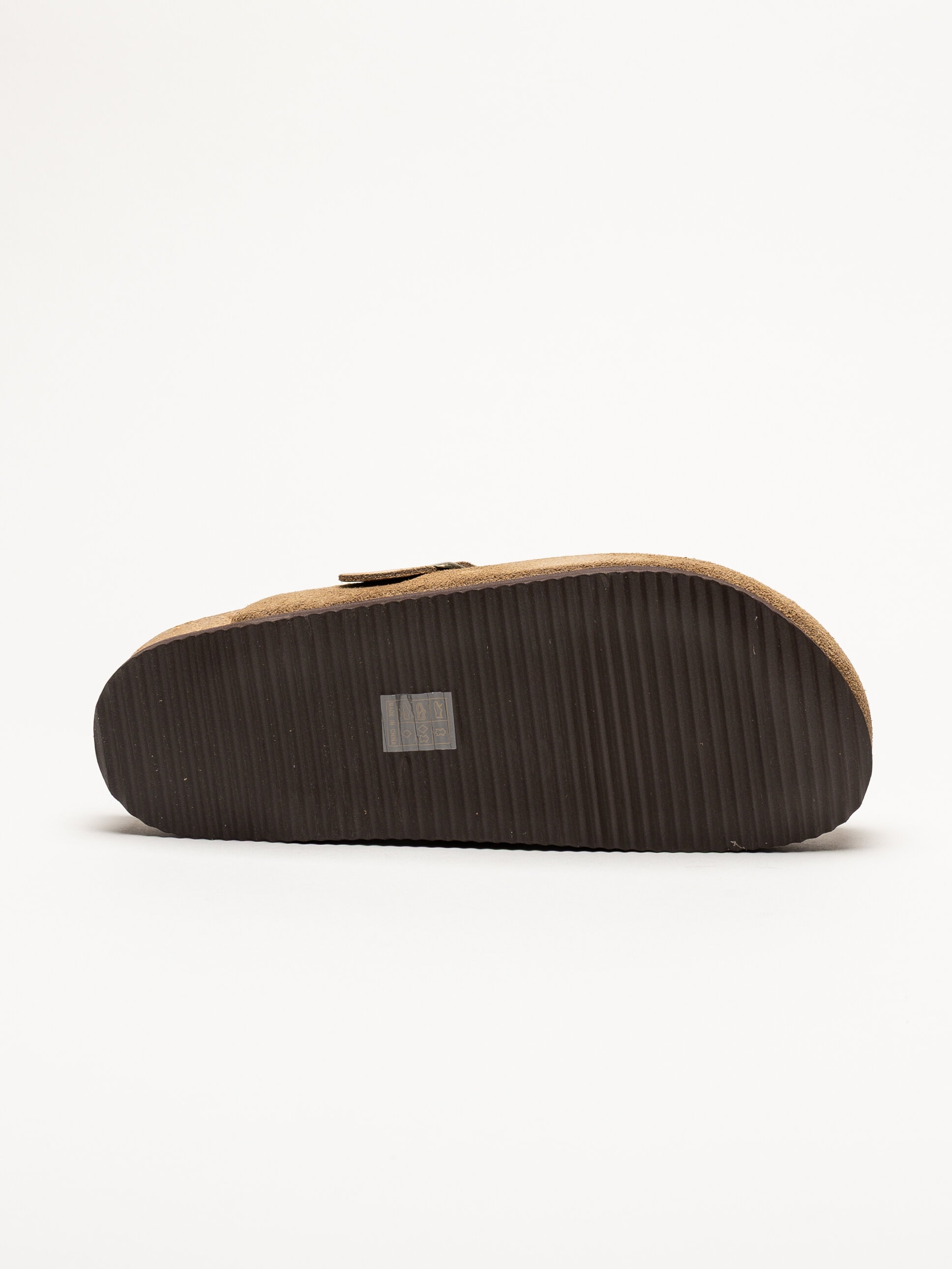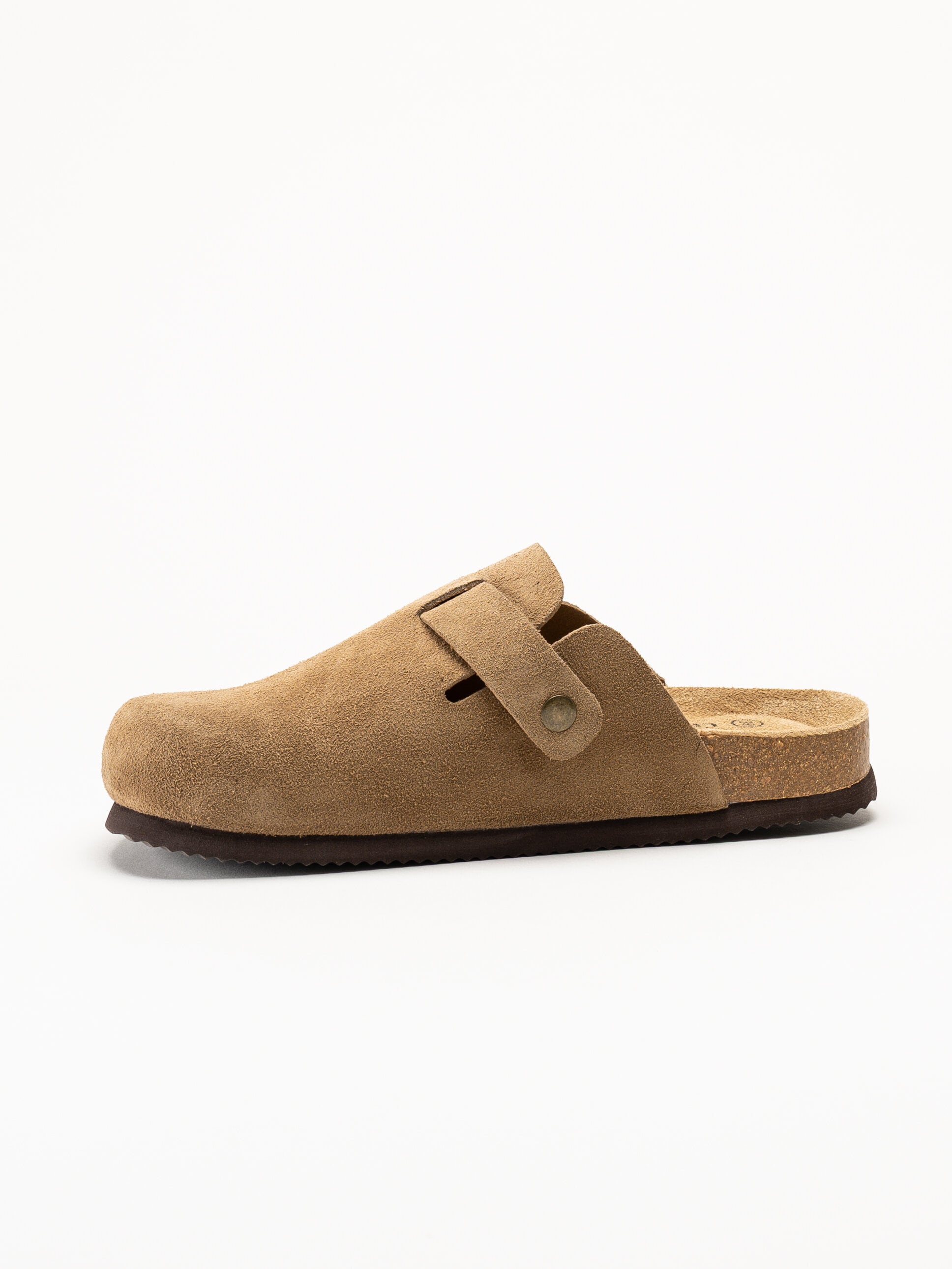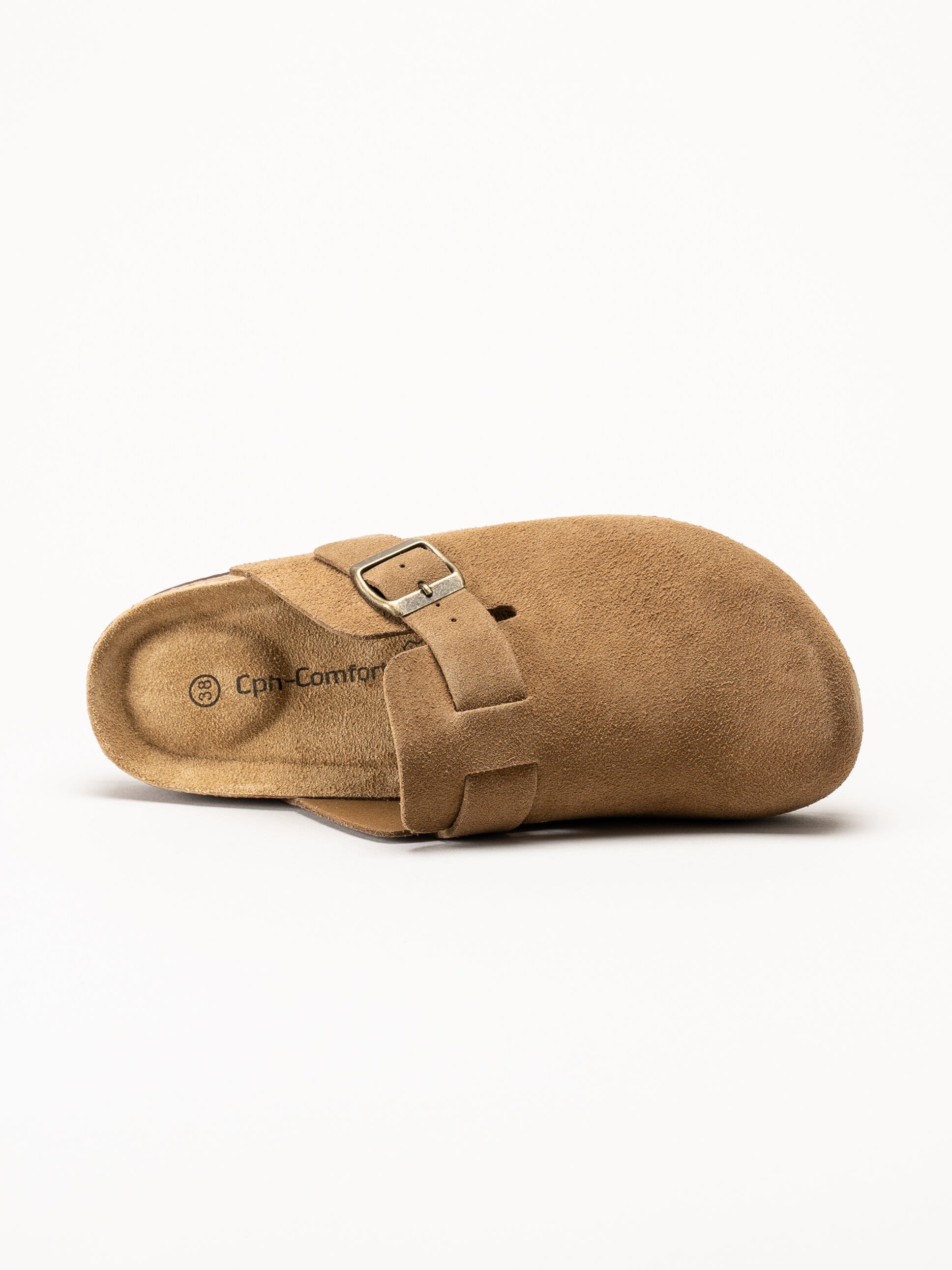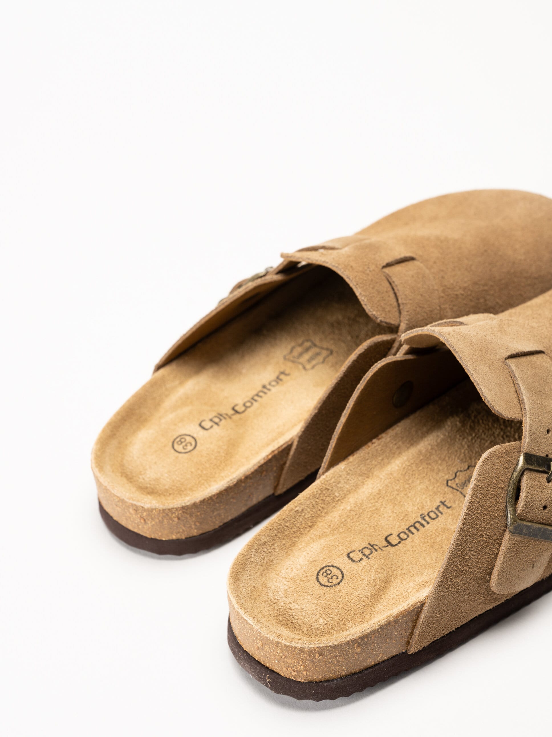 Bruna sandaler i mocka från CpH Comfort i färgen Camel med en stilren och bekväm design. Ovandelen är tillverkad i mjuk mocka som ger ett följsamt och elegant uttryck, och modellen har täckt tå för extra värme och skydd. Sandalerna har ett justerbart spänne som gör det enkelt att anpassa passformen efter foten.