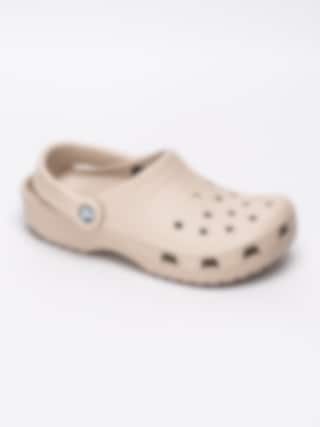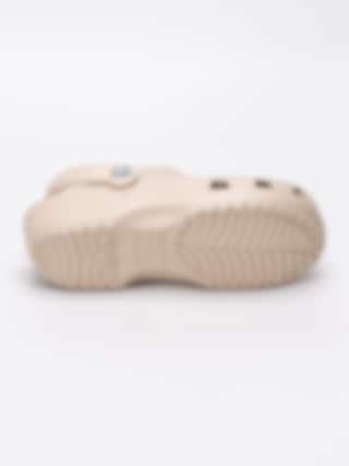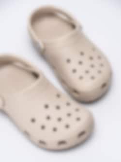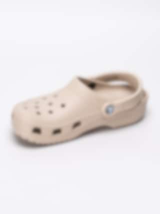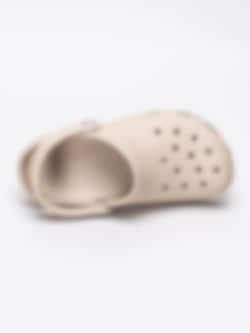 Beige tofflor Classic Clog från Crocs tillverkade i mjukt Croslite material för ökad komfort och stötdämpning. Lufthål på ovandel och vid främre partiet. Rem som går att fälla upp och ned. Rund svart plastbit med vit logga som håller remmen på plats. Yttersula i Croslite med randigt mönster.