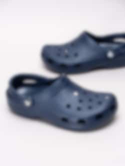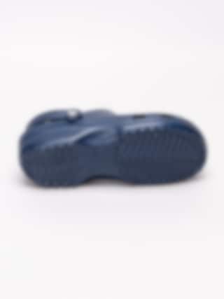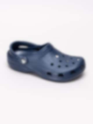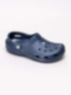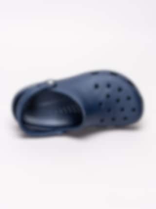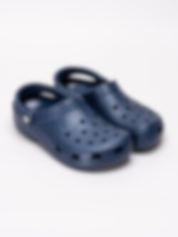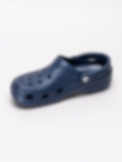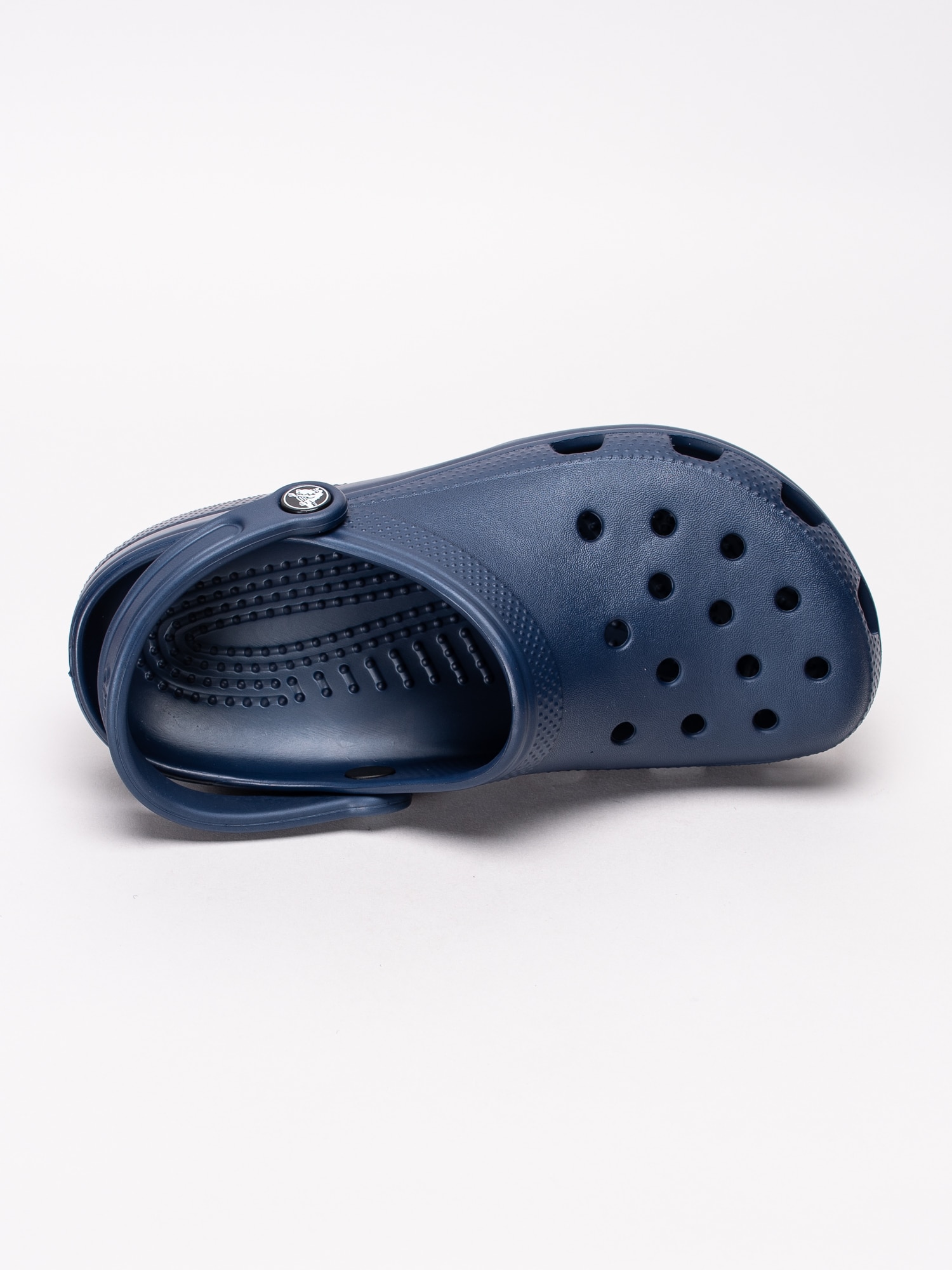 Mörkblå tofflor Classic Clog från Crocs tillverkade i mjukt Croslite material för ökad komfort och stötdämpning. Lufthål på ovandel och vid främre partiet. Rem som går att fälla upp och ned. Rund svart plastbit med vit logga som håller remmen på plats. Yttersula i syntet med randigt mönster.