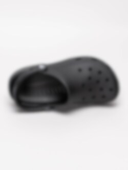Svarta tofflor Classic Clog från Crocs tillverkade i mjukt Croslite material för ökad komfort och stötdämpning. Lufthål på ovandel och vid främre partiet. Rem som går att fälla upp och ned. Rund svart plastbit med vit logga som håller remmen på plats. Yttersula i Croslite med randigt mönster.