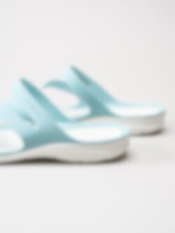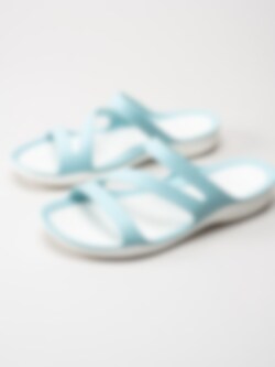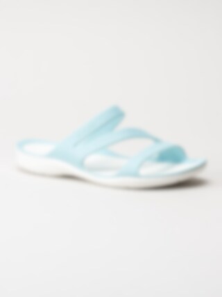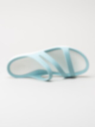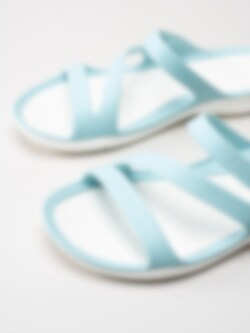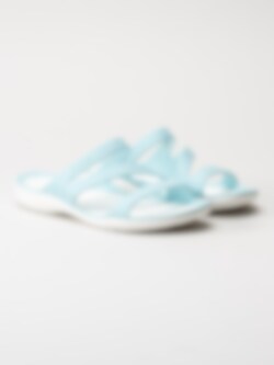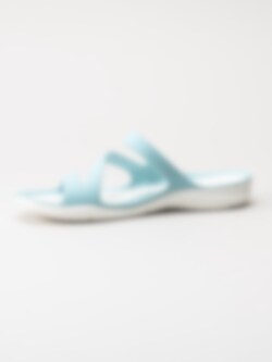 Ljusblå sandaler Swiftwater för kvinnor från Crocs tillverkade med sula i mjukt Croslite material för ökad komfort och stötdämpning. Slip in modell med korsade band som omsluter din fot med präglad logga på övre rem som detalj. Vit innersula med prickigt mönster och präglad logga i häl. Vit yttersula i syntet med mönster och präglad logga.
