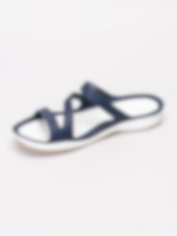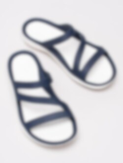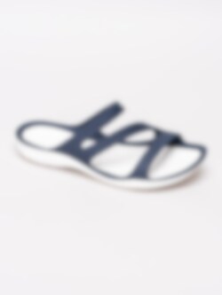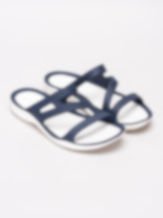 Mörkblå sandaler Swiftwater för kvinnor från Crocs tillverkade med sula i mjukt Croslite material för ökad komfort och stötdämpning. Slip in modell med korsade band som omsluter din fot med präglad logga på övre rem som detalj. Vit innersula med prickigt mönster och präglad logga i häl. Vit yttersula i syntet med mönster och präglad logga.
