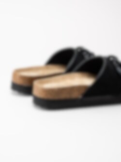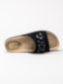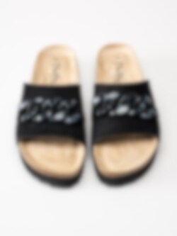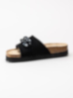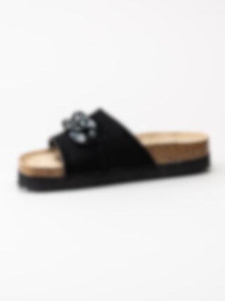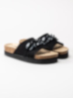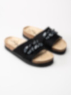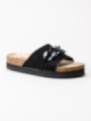 Svarta slip in sandaler med dekorlänk från Duffy. Somriga sandaler som piffar upp din outfit och hela vardagen. En svart chunky sula i syntet med en platåhöjd på ca 3cm. Unna dig ett par till finare väder!