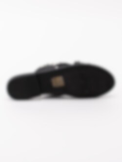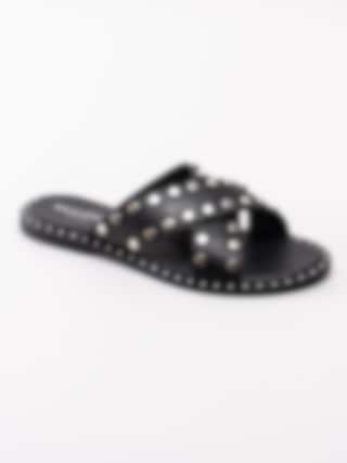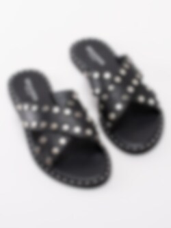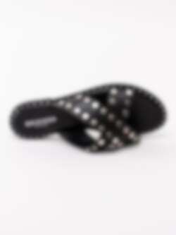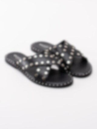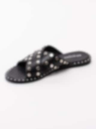 Svarta slip ins sandaler Alma från Ilse Jacobsen tillverkade i skinn med runda silverfärgade nitar i metall som detalj. Korslagda band som håller kvar skon på foten. Svart foder och innersula i skinn med sömlös vit logga i hälen. Små runda nitar längs sulkant. Klackhöjd på ca 1.5 cm. Svart yttersula i syntet med slät yta.