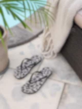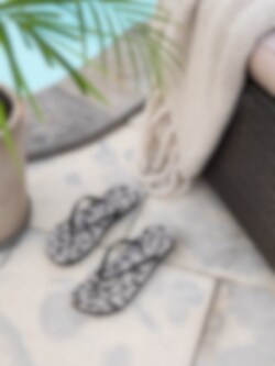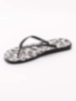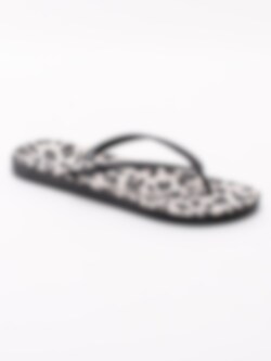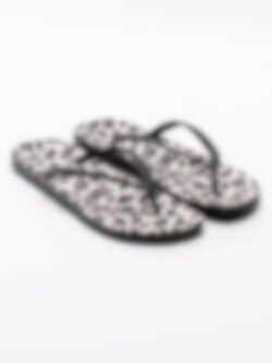 Svarta flip-flops Cheerful Paisley från Ilse Jacobsen. Snygga flip-flops med mönstrad sula med leopard-motiv. Glittriga remmar för att ge denna lediga modell en dressad look som kan matchas lika väl med bikinin till stranden som till den svarta bohemiska klänningen till kvällsmiddagen. Sömlös logotyp längs sulkant. Svart yttersula med randigt mönster.
