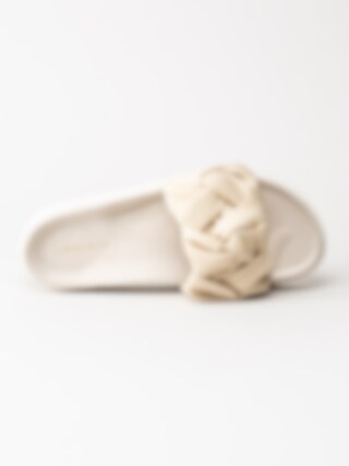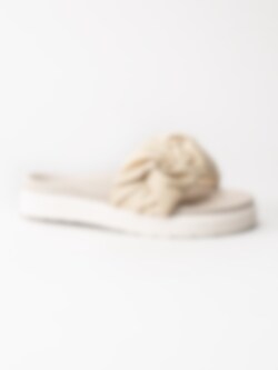 Beige slip in sandaler Fjord Flower i textil från Inuikii. Sköna slippers med bred flätad rem och formad fotbädd i mocka.