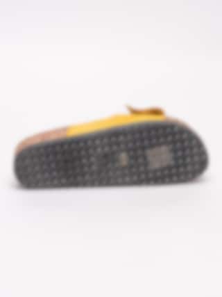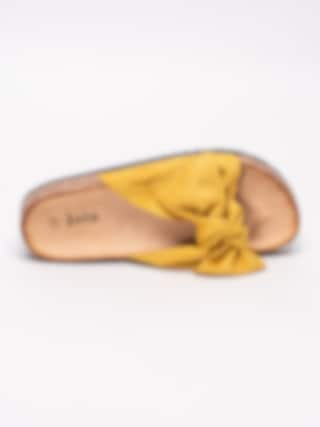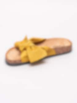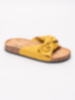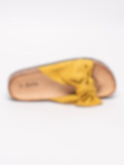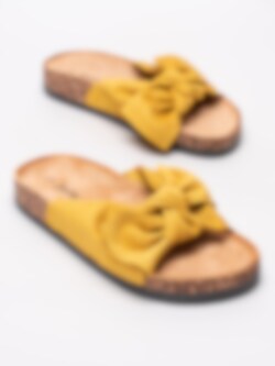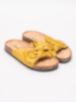 Gula slip in sandaler från Joia tillverkade i textil med stor rosett. Lätta sandaler och enkla att ta på. Gult foder och beige innersula i textil med sömlös logga i hälen. Mellansula i korkimiation med upphöjd kant. Mörkbrun yttersula i syntet mönster och präglad logga i mitten.