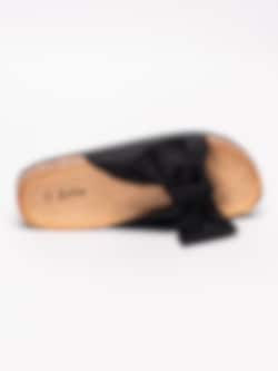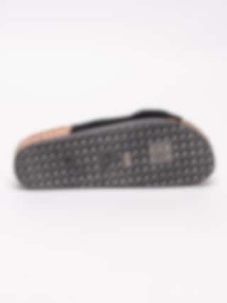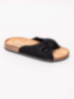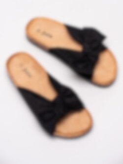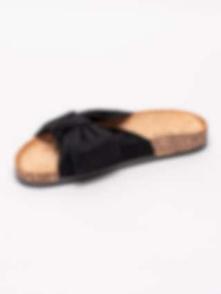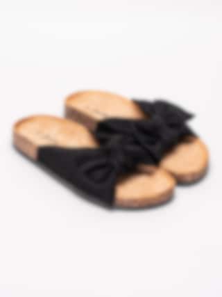 Svarta slip in sandaler från Joia tillverkade i textil med stor rosett. Lätta sandaler och enkla att ta på. Svart foder och beige innersula i textil med sömlös logga i hälen. Mellansula i korkimiation med upphöjd kant. Svart yttersula i syntet mönster och präglad logga i mitten.