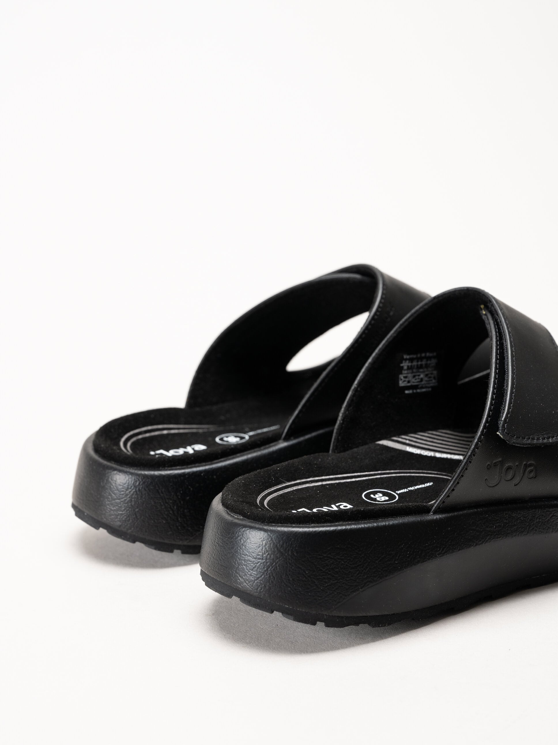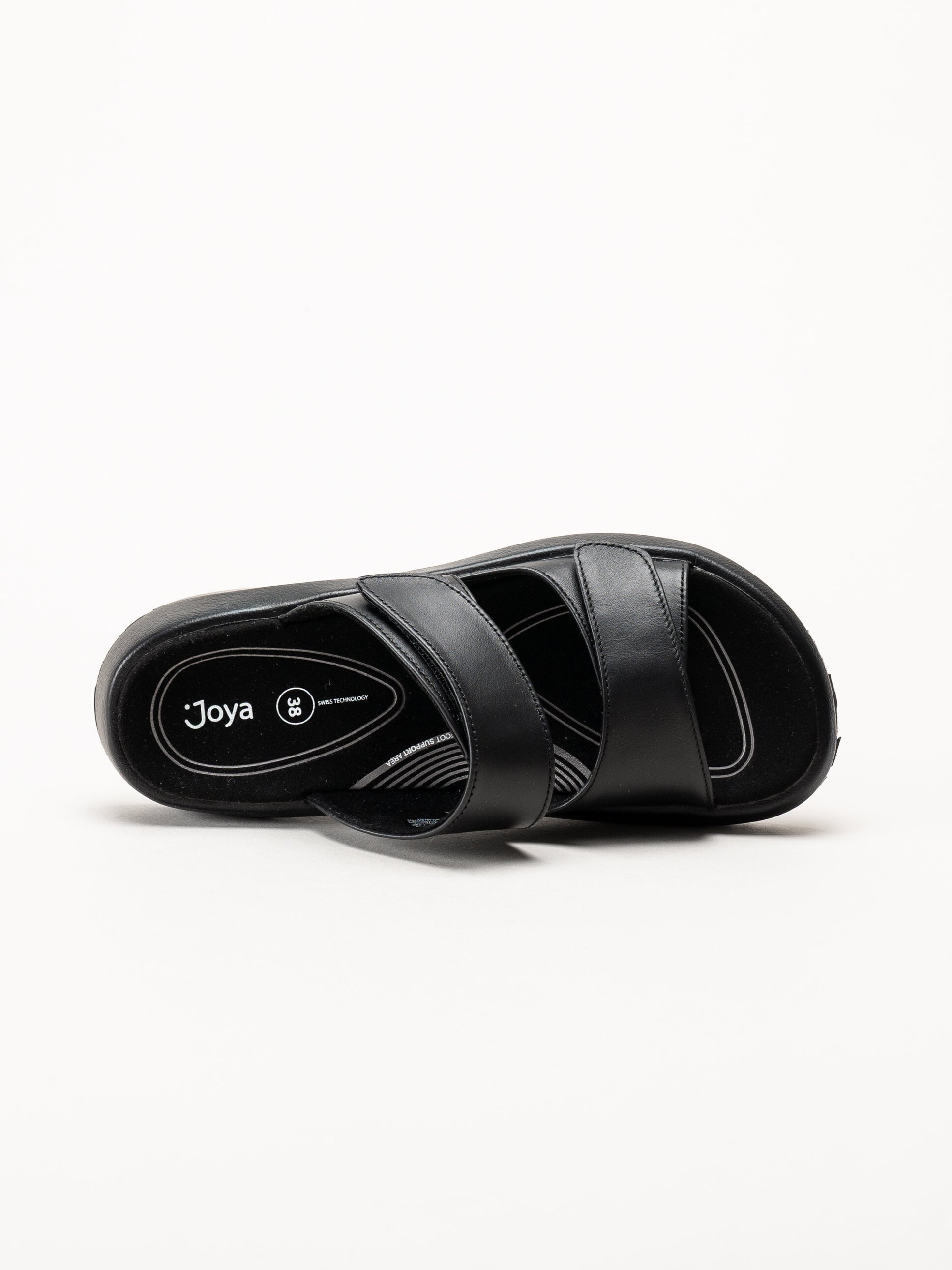 Svarta sandaler i skinn från Joya. Sandalerna är tillverkade i mjukt skinn med följsam känsla, vilket ger en stilren och praktisk design som lämpar sig lika bra för vardagsbruk som för längre dagar på fötterna. Invändigt är modellen fodrad med textil för en behaglig känsla mot foten, och innersulan i textil bidrar med mjuk komfort och stöd under hela dagen. Med Joyas Swiss Technology får du en ergonomiskt uppbyggd sula som ger effektiv stötdämpning, avlastar leder och rygg samt främjar ett naturligt steg.