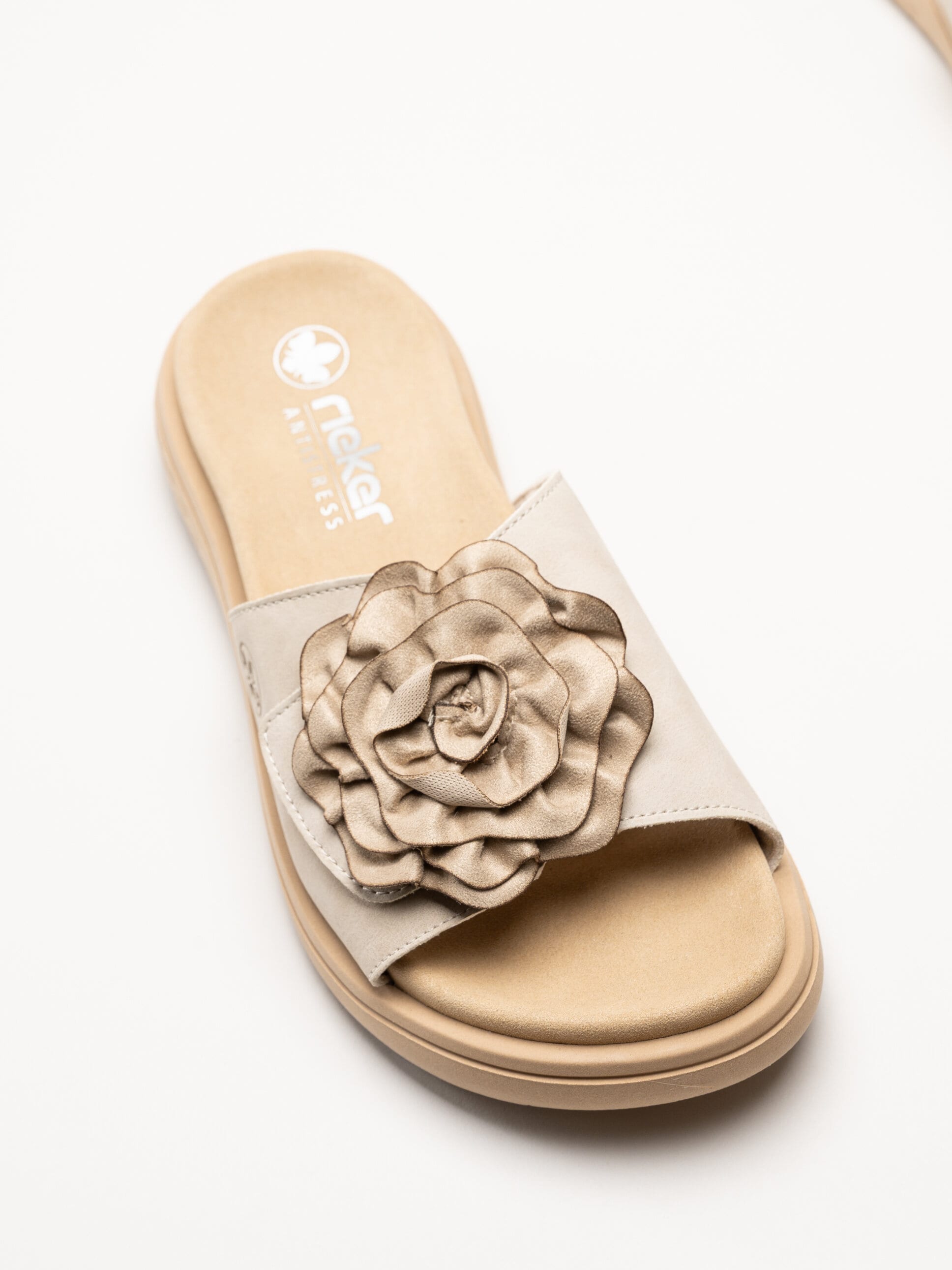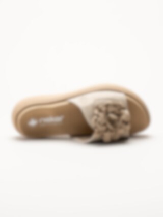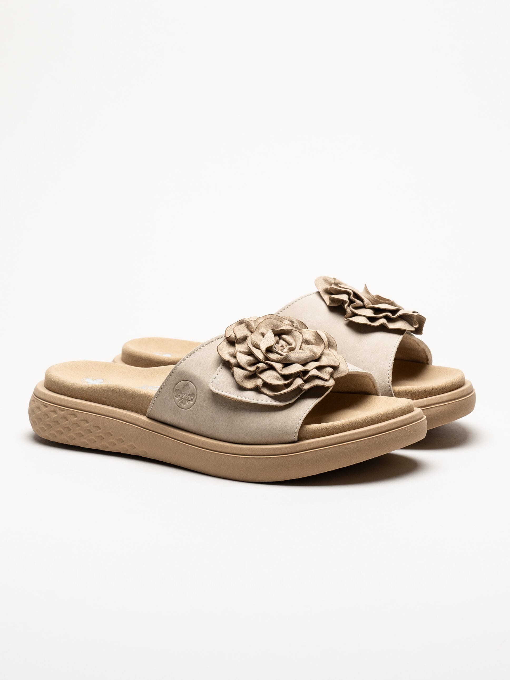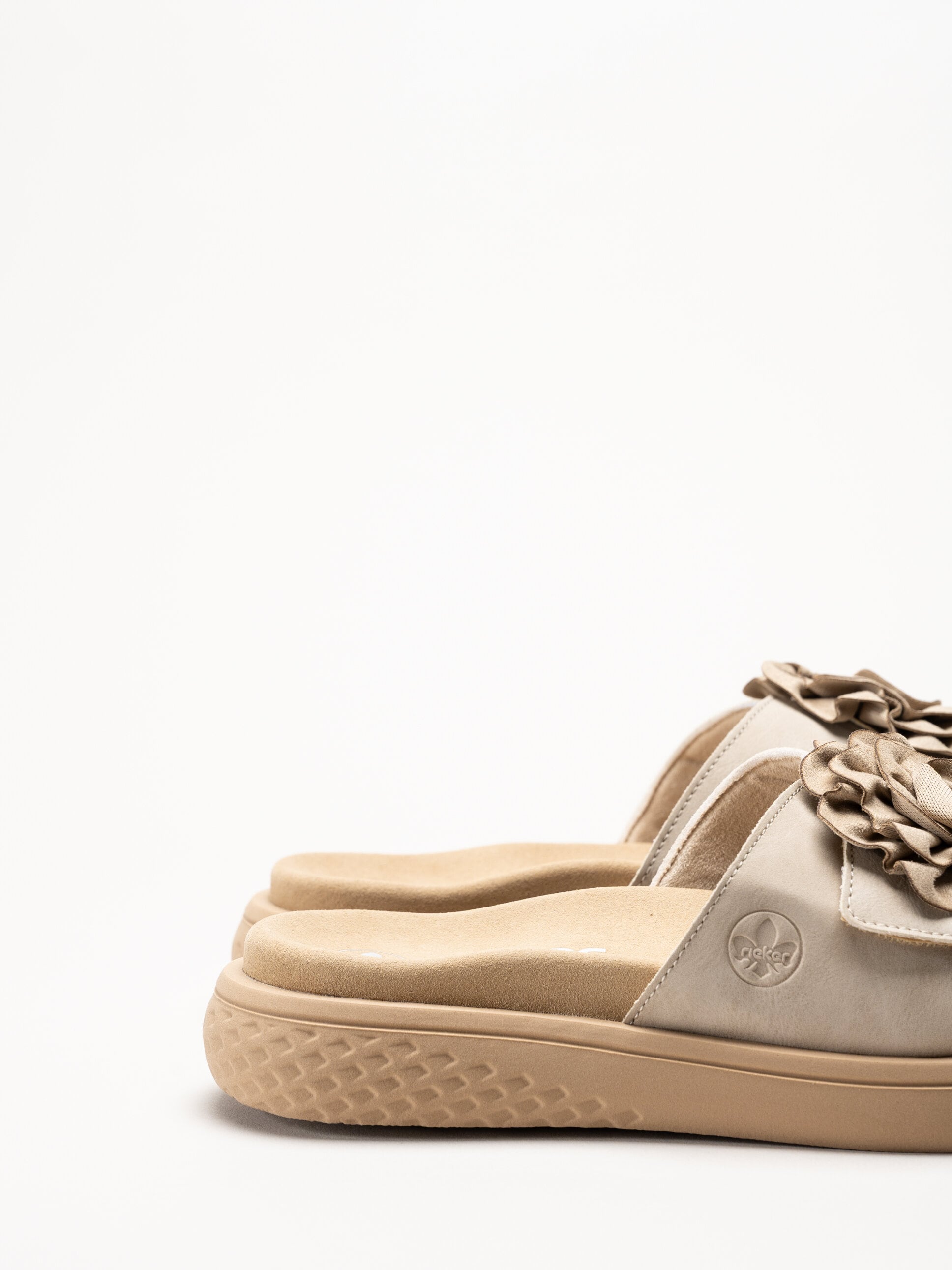 Beige sandaler från Rieker i färgen Ginger med en stilren och feminin design. Ovandelen är tillverkad i skinnimitation och pryds av en stor rosett över foten som ger ett dekorativt uttryck. Modellen har en justerbar kardborrestängning som gör det enkelt att anpassa passformen efter foten.