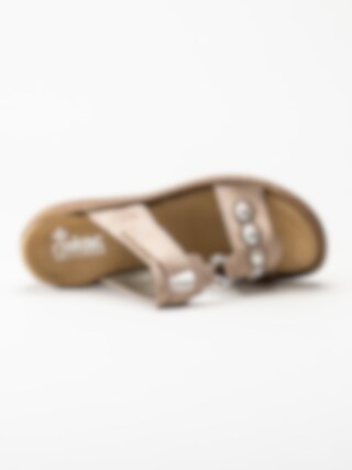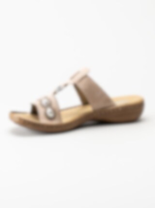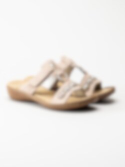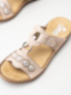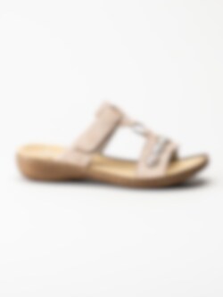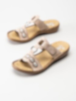 Beige slip in sandaler med pärldekor från Rieker. Sköna sandaler som är lätta att glida in i. Önskar du en snävare passform kan du enkelt justera det med kardborrebanden. Tvinnad metallring som håller ihop vrist- och fotrem. Sommarens enkla val - bekväma, lätta och sköna!