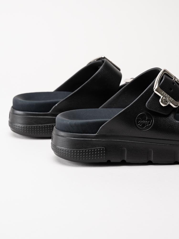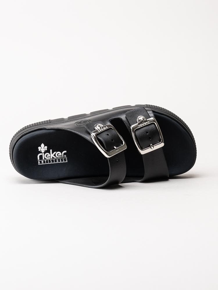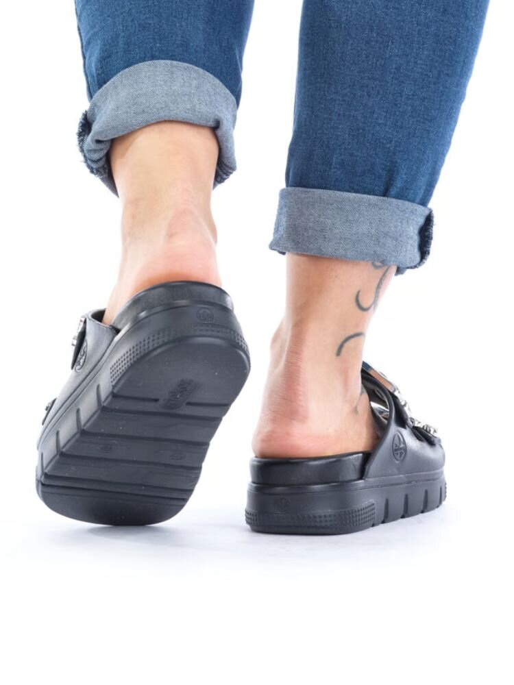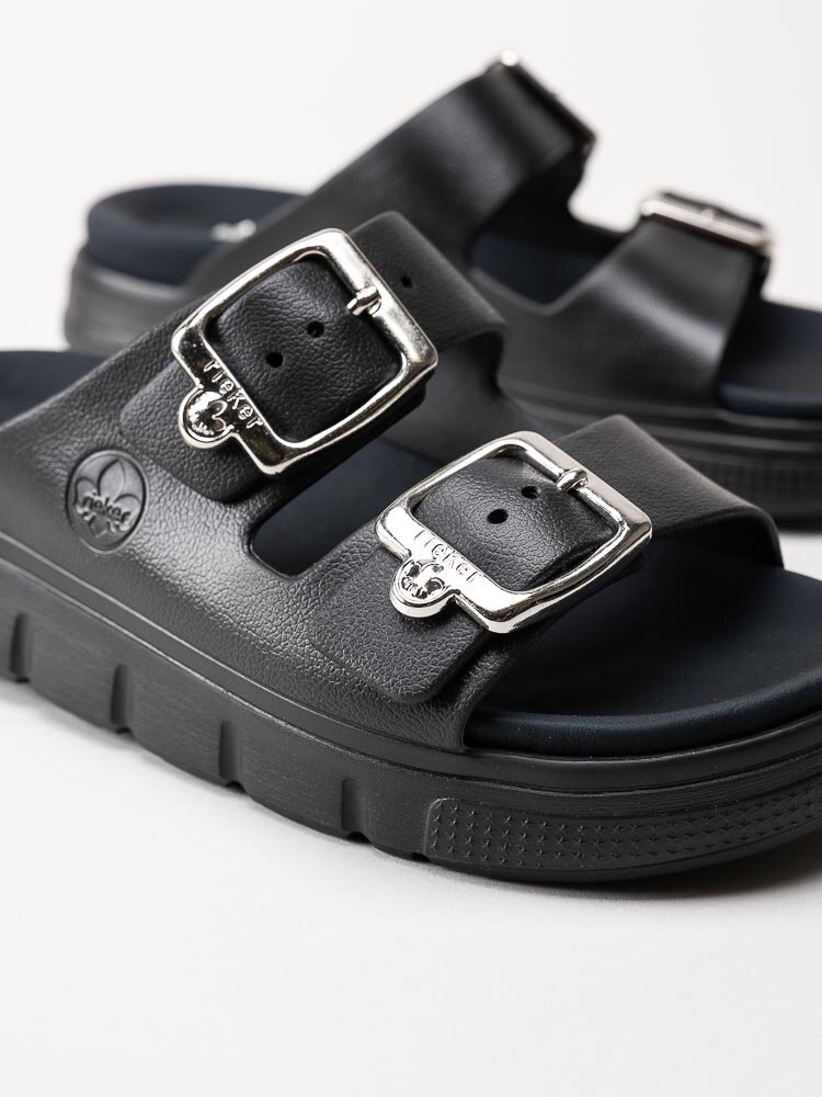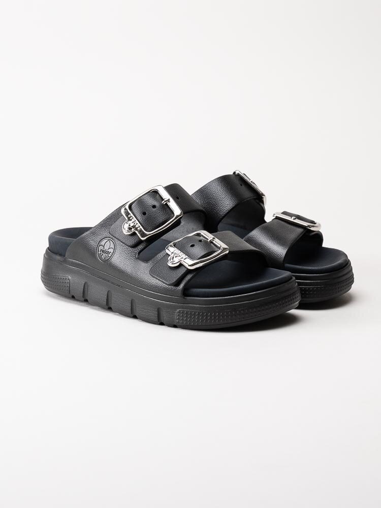 Svarta slip in sandaler i skinnimitation från Rieker. Skorna är framställda i slitstark syntet som ger ett stilrent och följsamt uttryck, perfekt för både vardag och sommarens lediga stunder. De två större spännena framtill gör det enkelt att justera passformen individuellt.