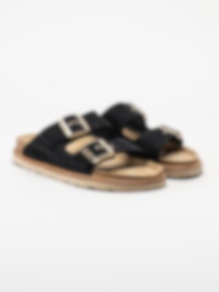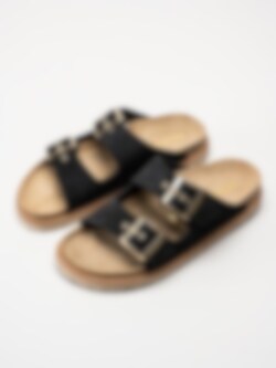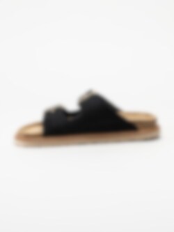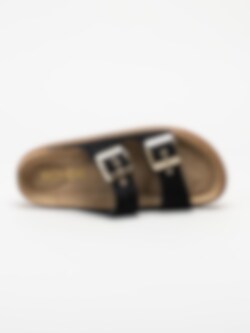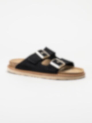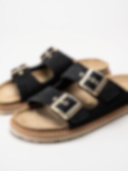 Slip in sandaler Messina Black i mocka från Rohde. Klassiska slippers med guldfärgade spännen och bekvämt foder och innersula i mocka. Härliga slip in sandaler som fungerar lika bra utomhus som inomhus.